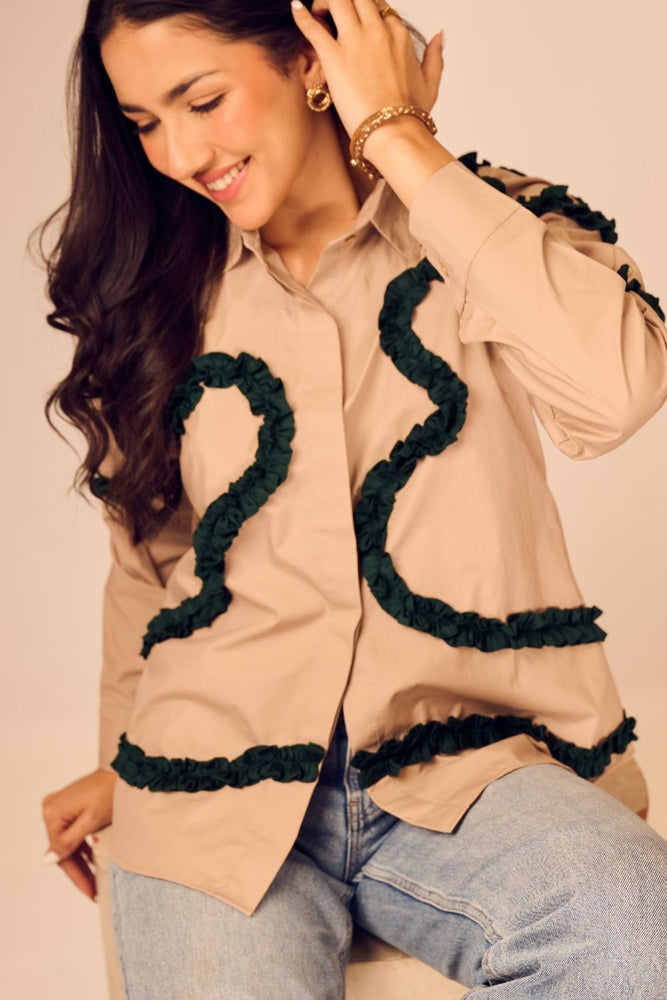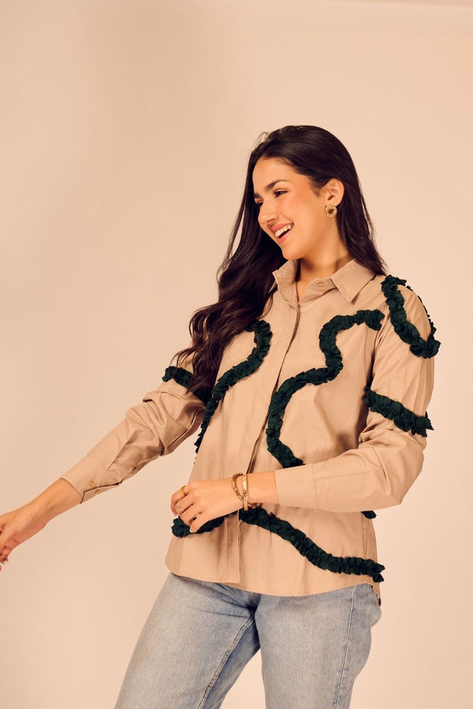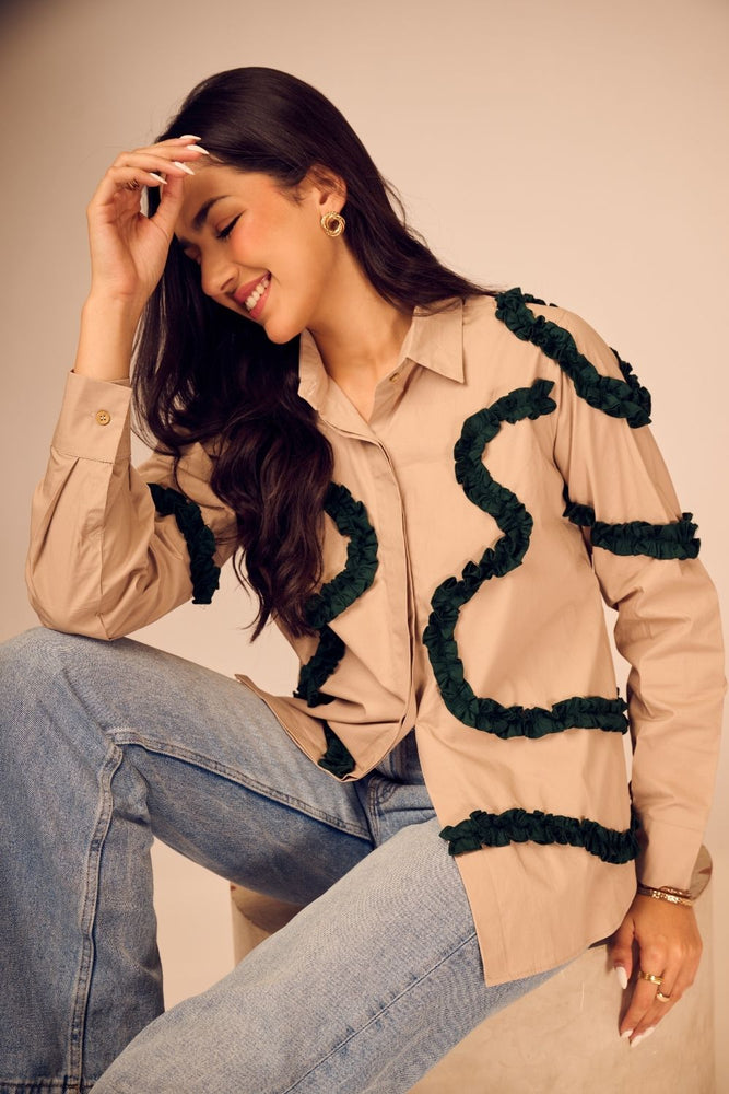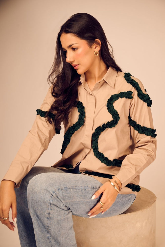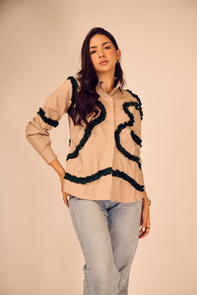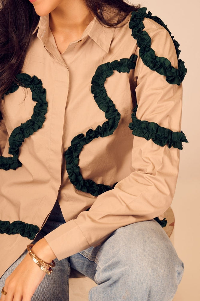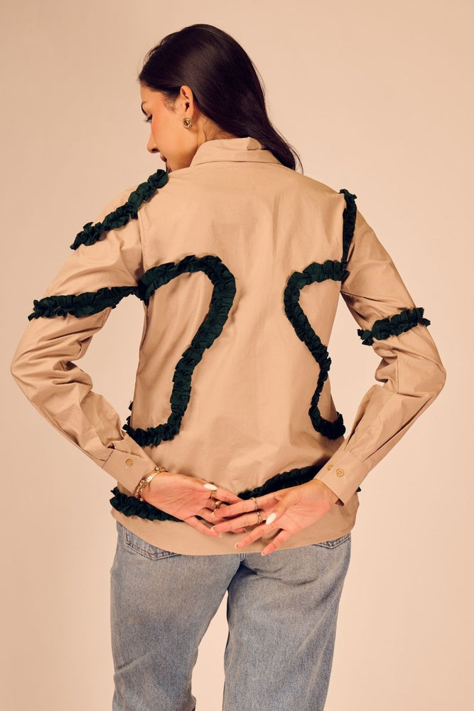 Minimalist at first glance, statement-making on closer look — this beige cotton poplin shirt is brought to life with emerald green frills placed in abstract formations. The soft structure of the fabric meets artistic detailing.