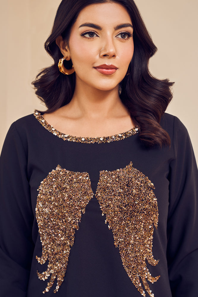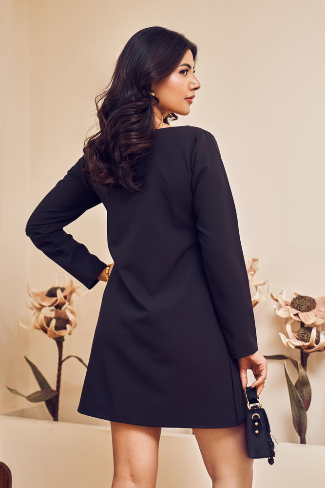 Step into the spotlight with angelic grace, this dress will make hearts race! Boat neck lined with shimmer, this full-sleeved mini dress hits the perfect note of formal and fun!- Delivery time within India - 10-15 business days.