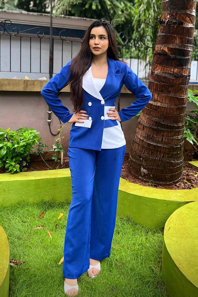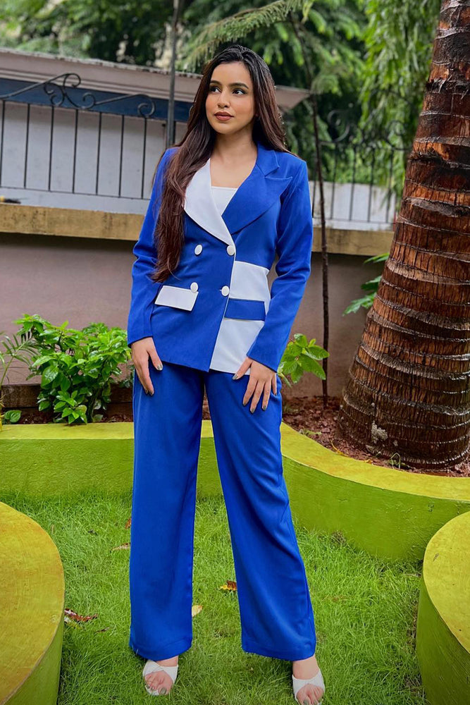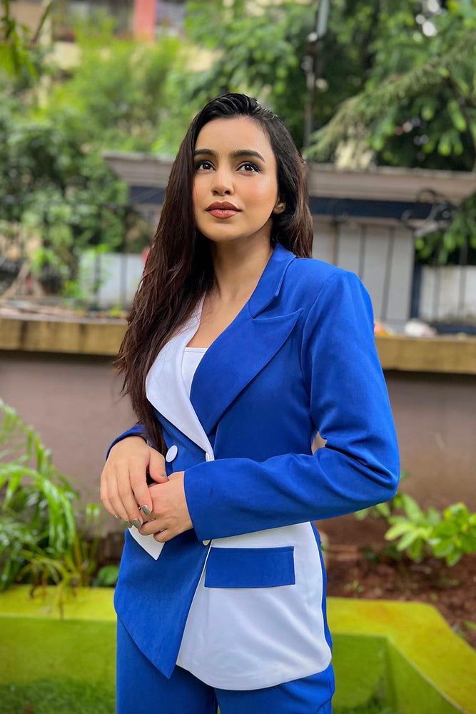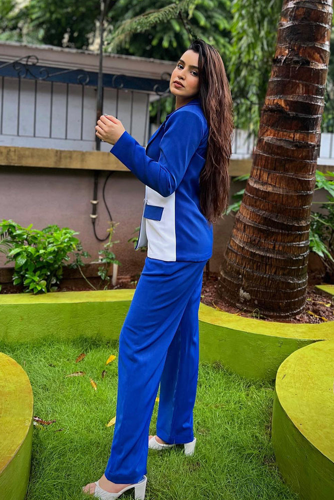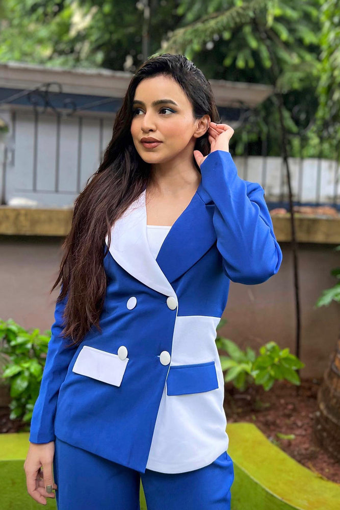 • The blazer is colour blocked in royal blue and white • Blazer Collar