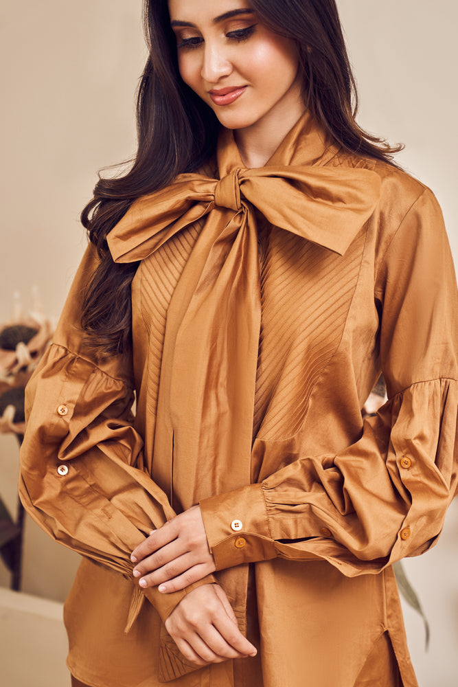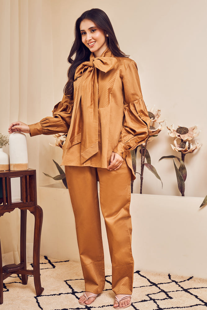 Digging that Swish Gold, we found the most stunning co-ord! Showcasing balloon elbow sleeves, textured neckline, asymmetrical hemline, the biggest bow and detailed cuffs, this unique shirts pairs so well with our matching textured trousers.