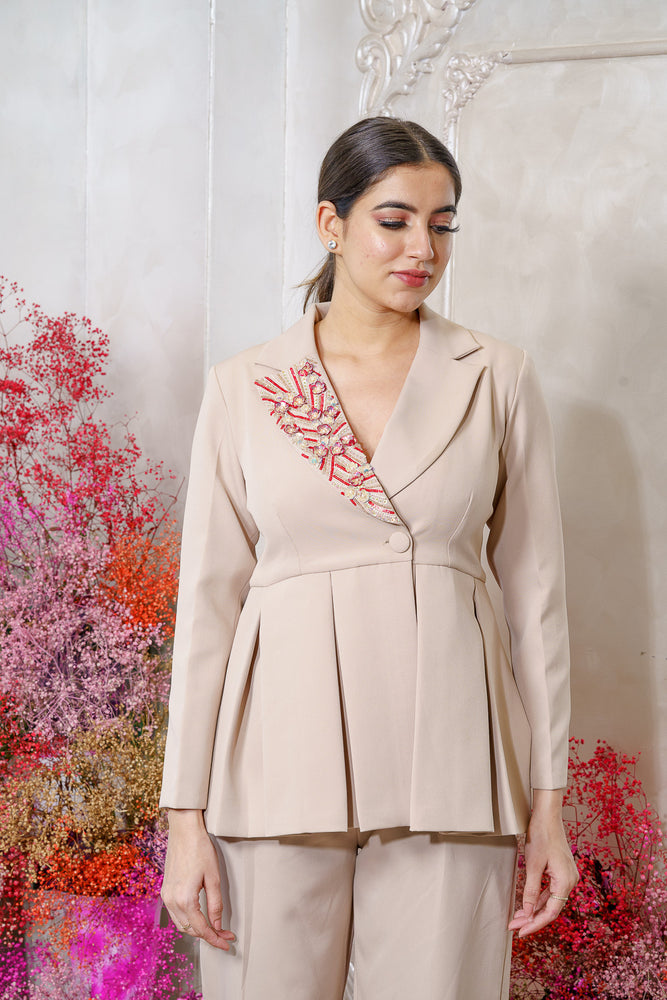 • You will receive a beige moss crepe blazer and a pant • It has a beautiful floral embellishment on the collar. • Peplum blazer