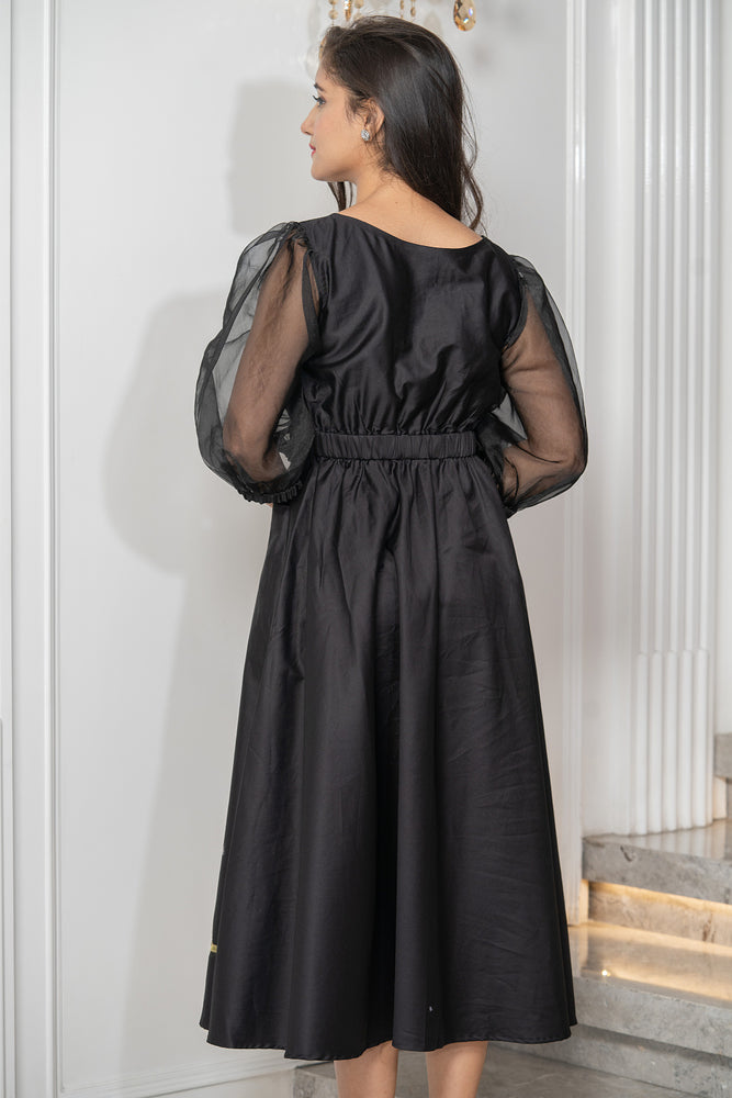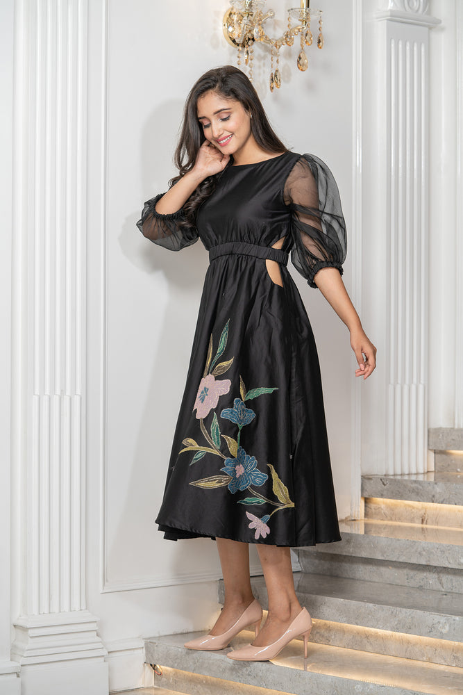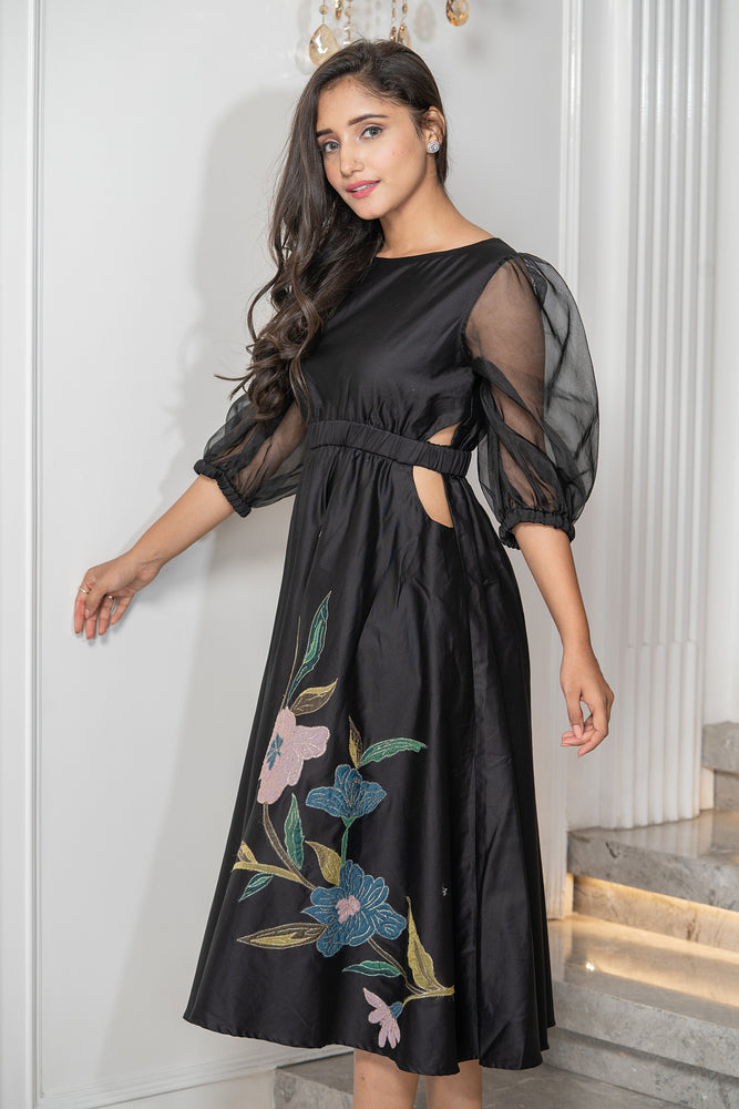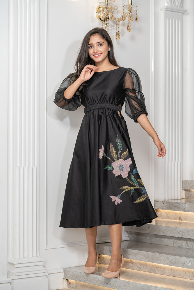 • Details ;Cotton Midi Dress With Boat Neck , Elastic On Waist , Cuts On Waist, With Organza Ballon Sleeves & Floral Patch