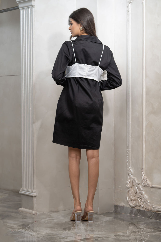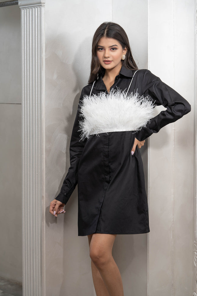• You will receive a white cotton shirt dress with black feather crop top.