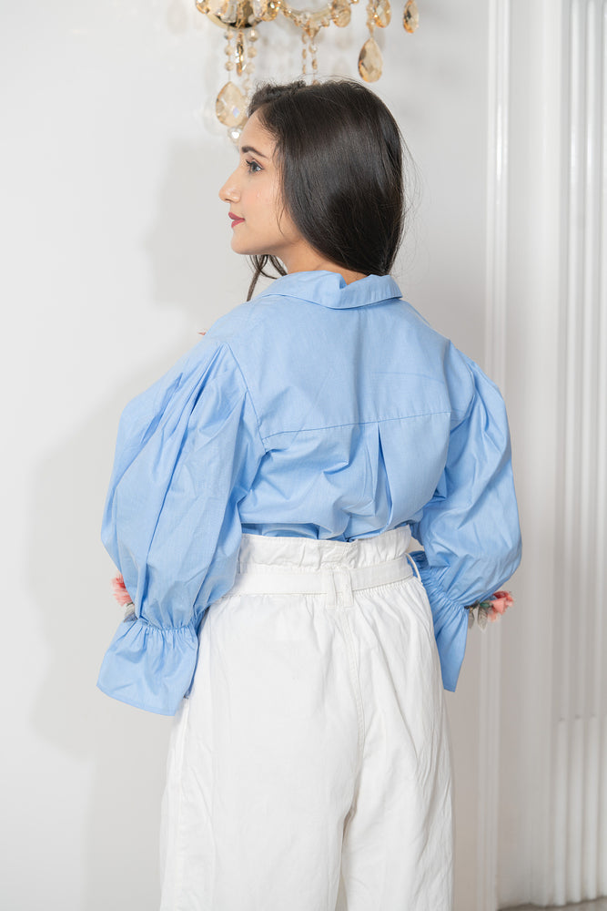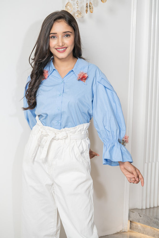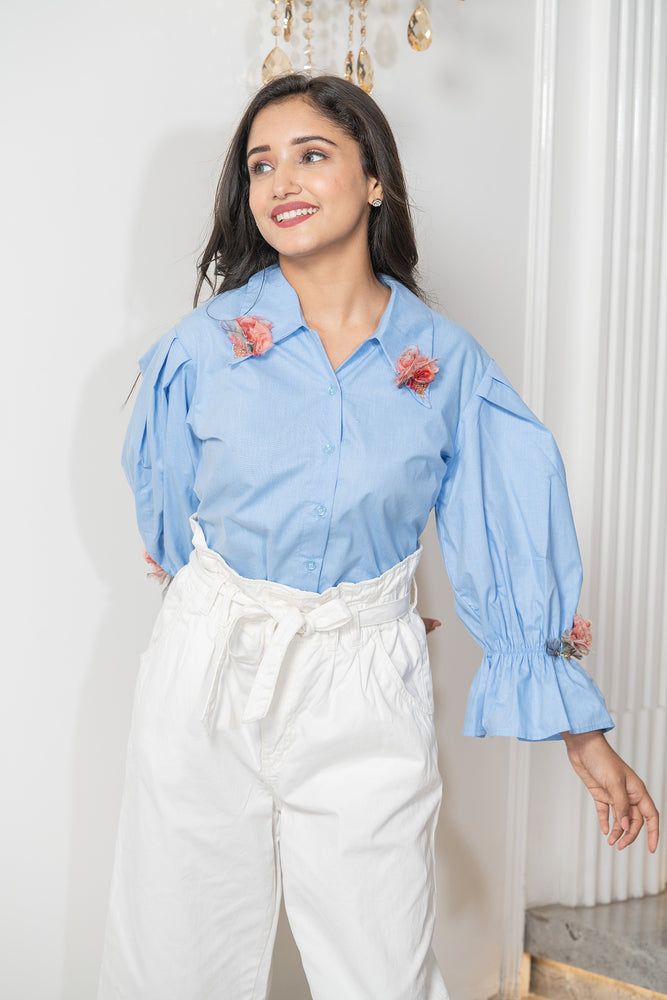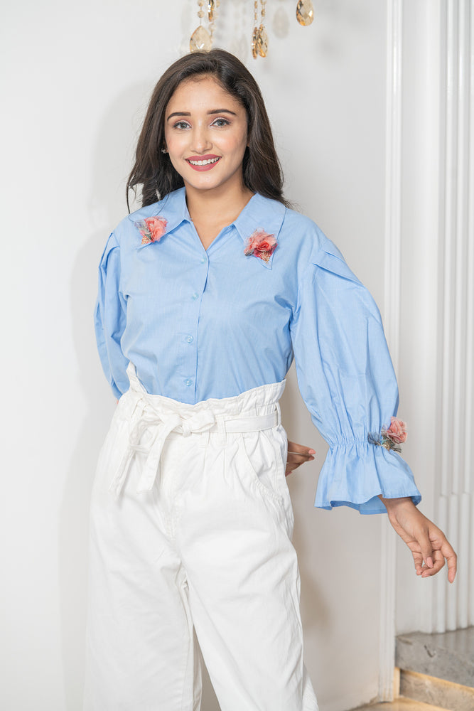 • Details ; Ballon Sleeves Shirt With 3D Floral Print Patch
