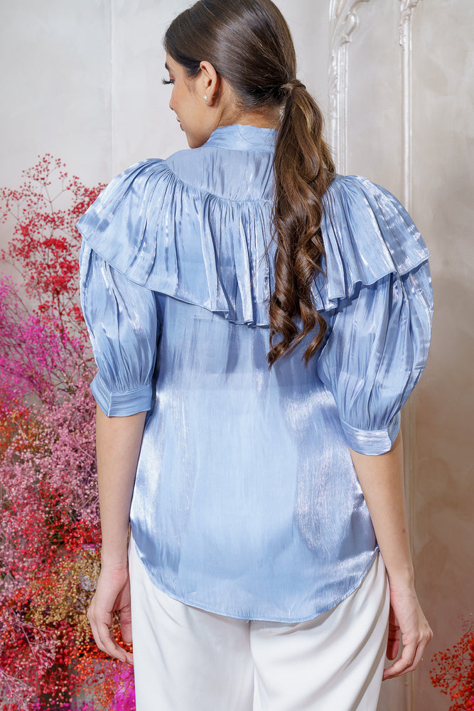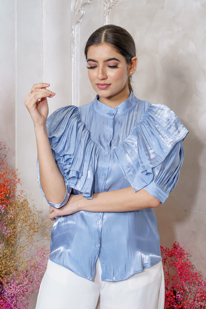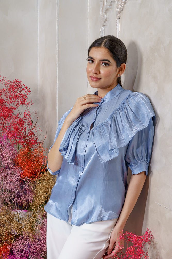 • You will receive a blue paper satin shirt. • It has frills in the front • Stand collar • Single placket • Balloon sleeves • Elbow length sleeves • Front open button down shirt • Tailored fit