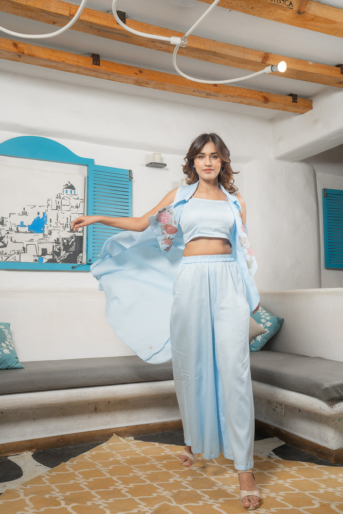 • Details ; Straight Pant & Crop Top With Open Jacket With Floral Patches