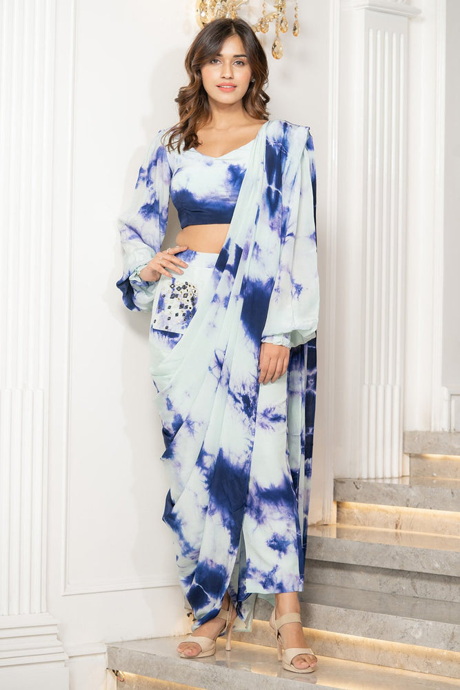 This Three Piece Set Includes Blouse ,Pants and Drape SareeBlouse - Tye Dye Powder Blue & Navy Blue V -Neck Blouse With Deep Back & Full Ballon Sleeves With Smokking Details.