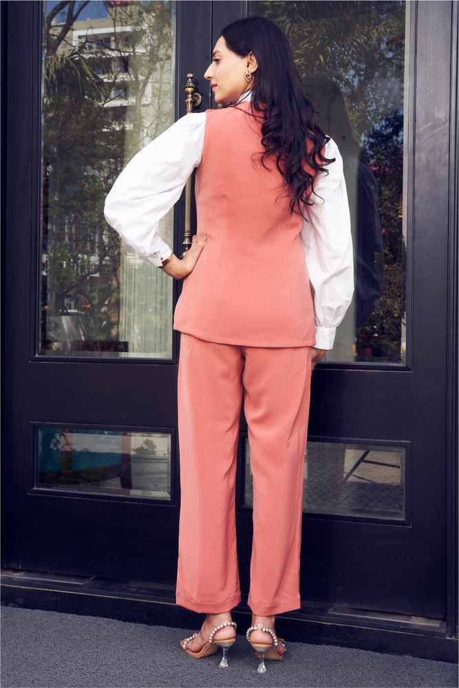 You will receive a blush rust moss crepe blazer and a pant along with a cotton shirt