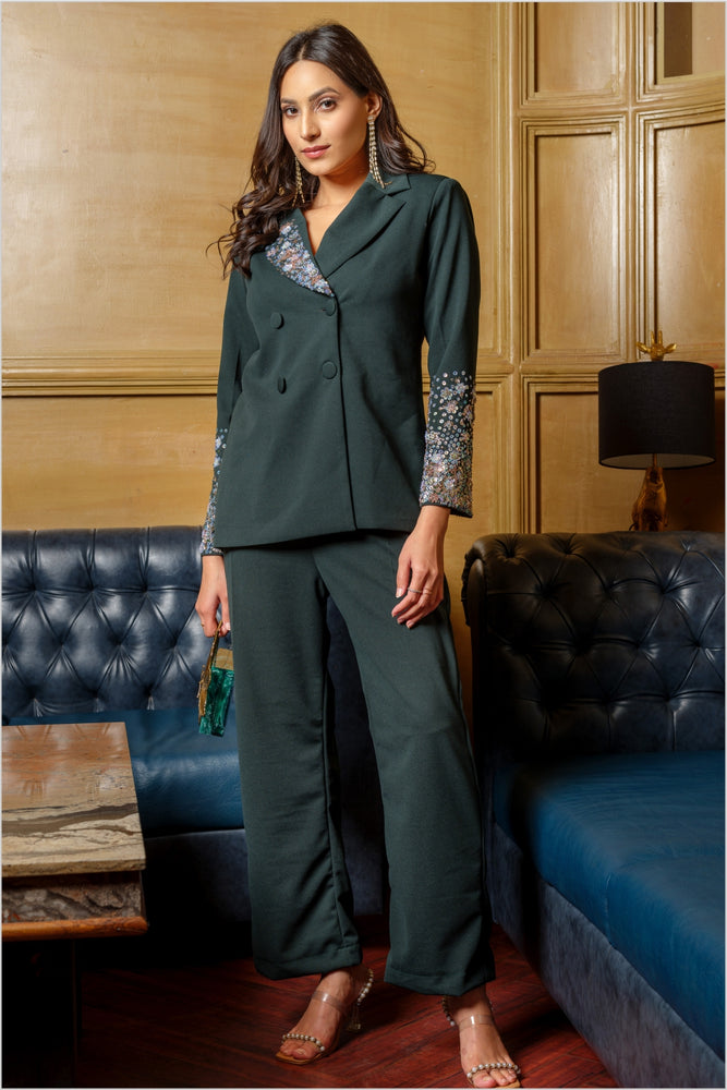 • You will receive a bottle green moss crepe blazer and a pant • It has a beautiful floral embellishment on the sleeve and collar.