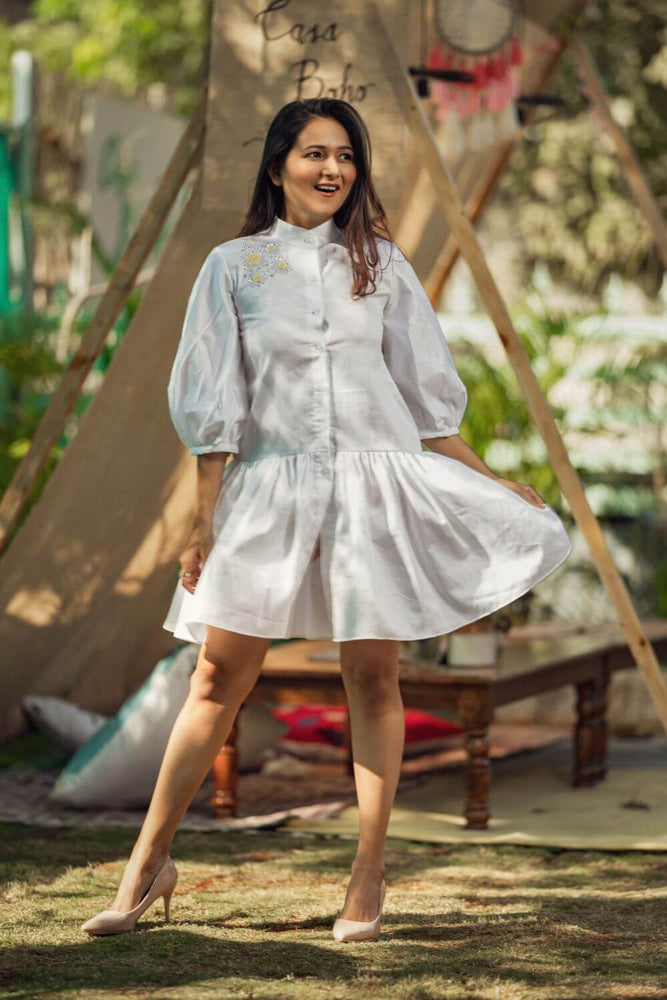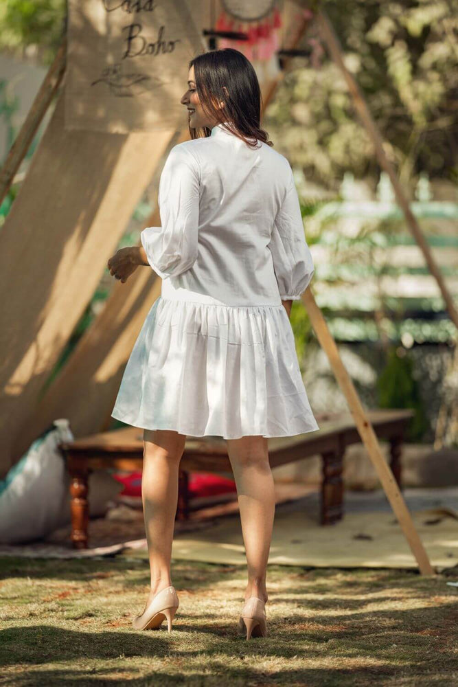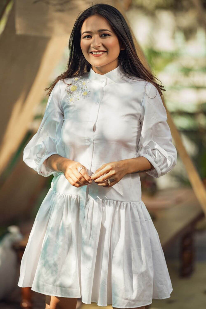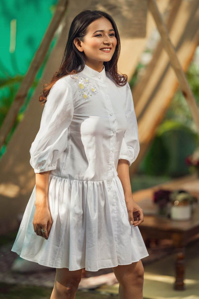 • Details: Mini Dress With Stand Collar & Frill With Floral Embellishment On shoulder