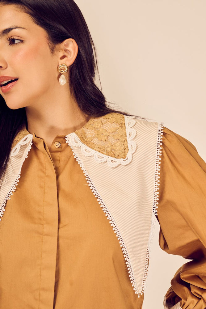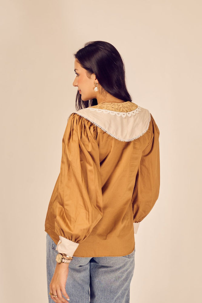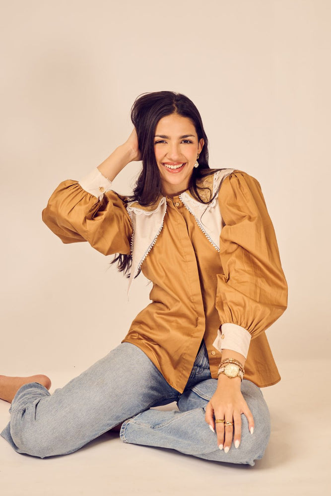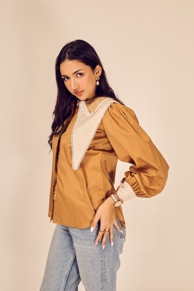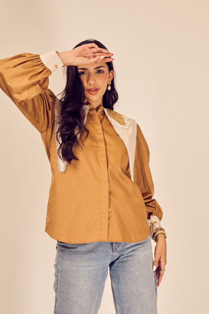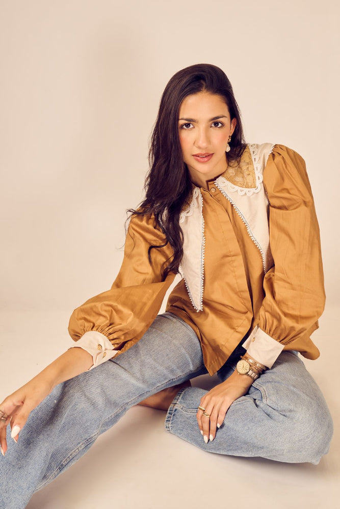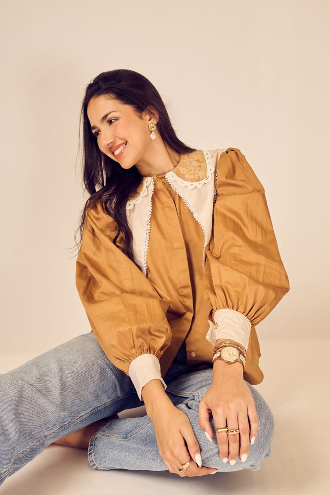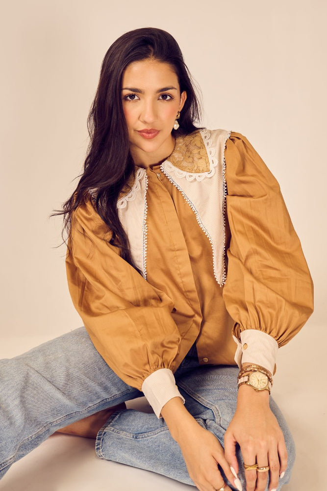 A signature piece that blends structure with soft femininity. This mustard cotton shirt features a statement double collar crafted in striped cotton and lace, finished with delicate lace accents that add charm and character.