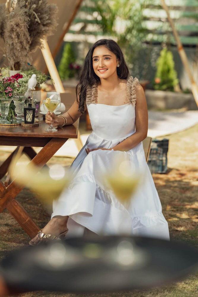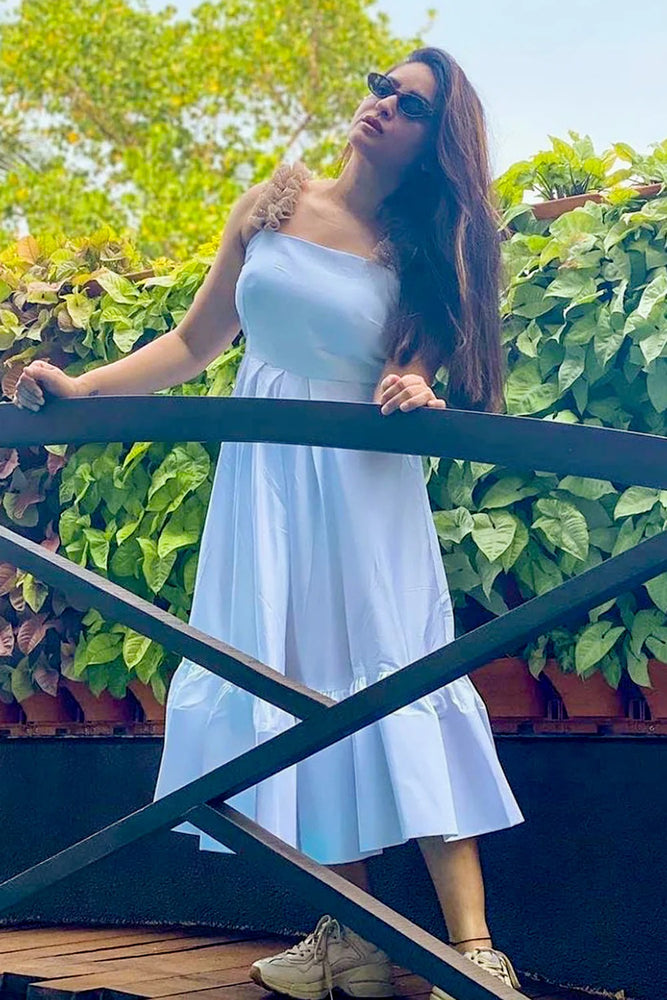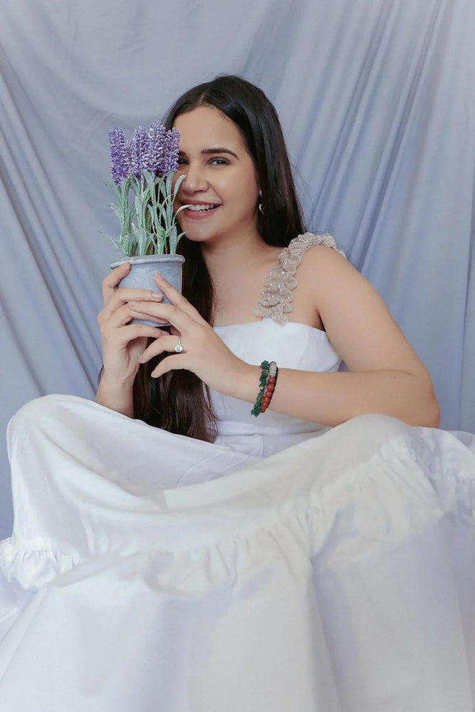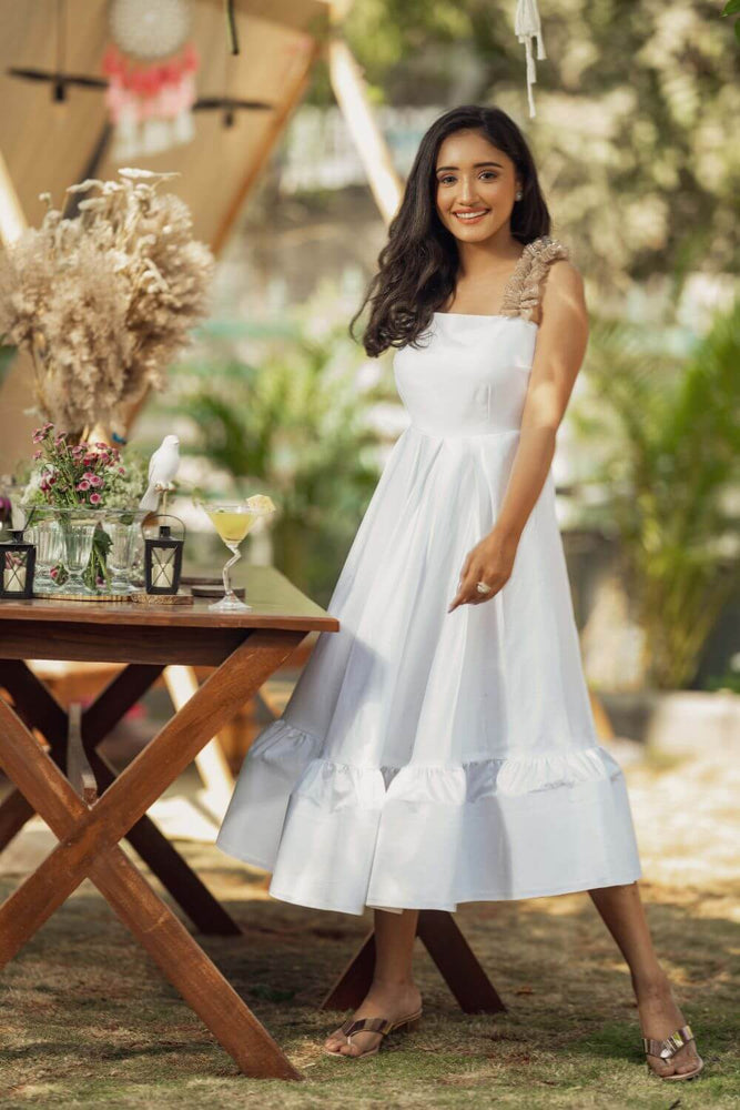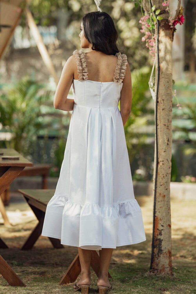 • Details:White Cotton Dress With Box Pleat Flare & Sequin Ruffled Strap