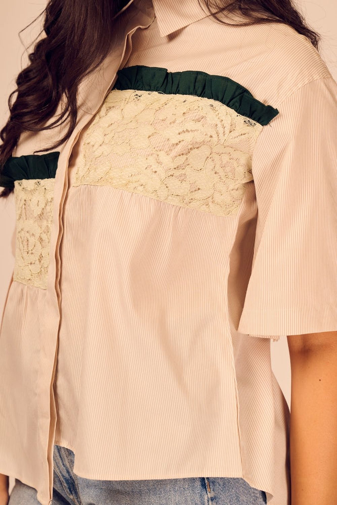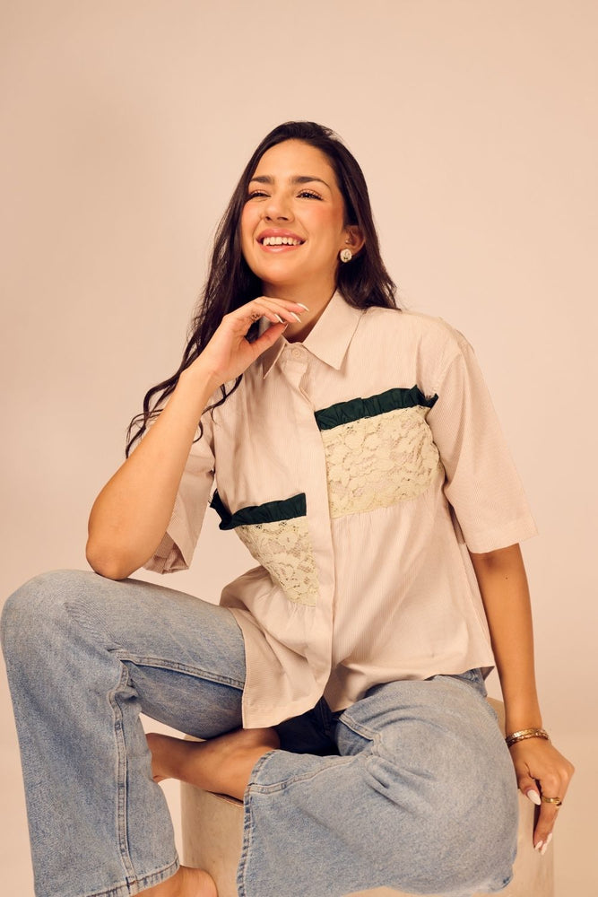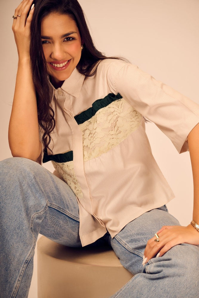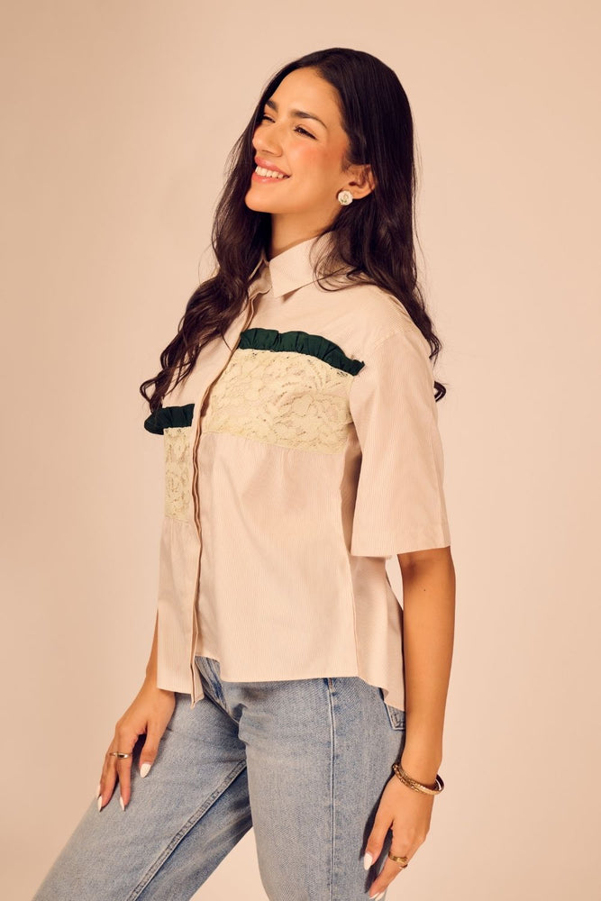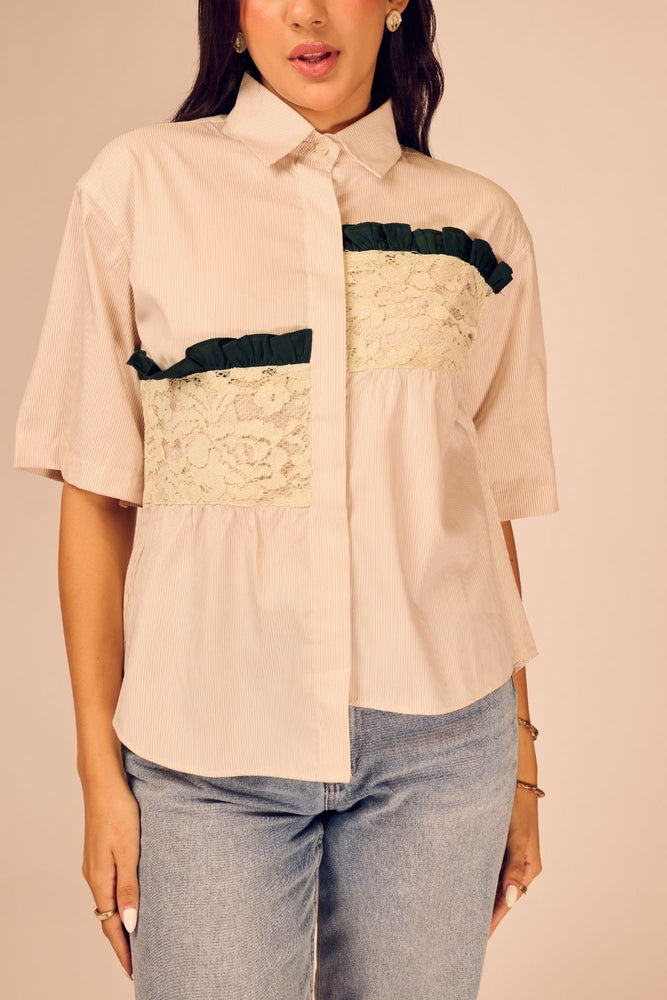 A playful take on linear minimalism, this striped cotton shirt features an asymmetric up-and-down hemline enhanced with soft mint lace patching. Contrasting emerald green frills add a vibrant pop of color and movement.