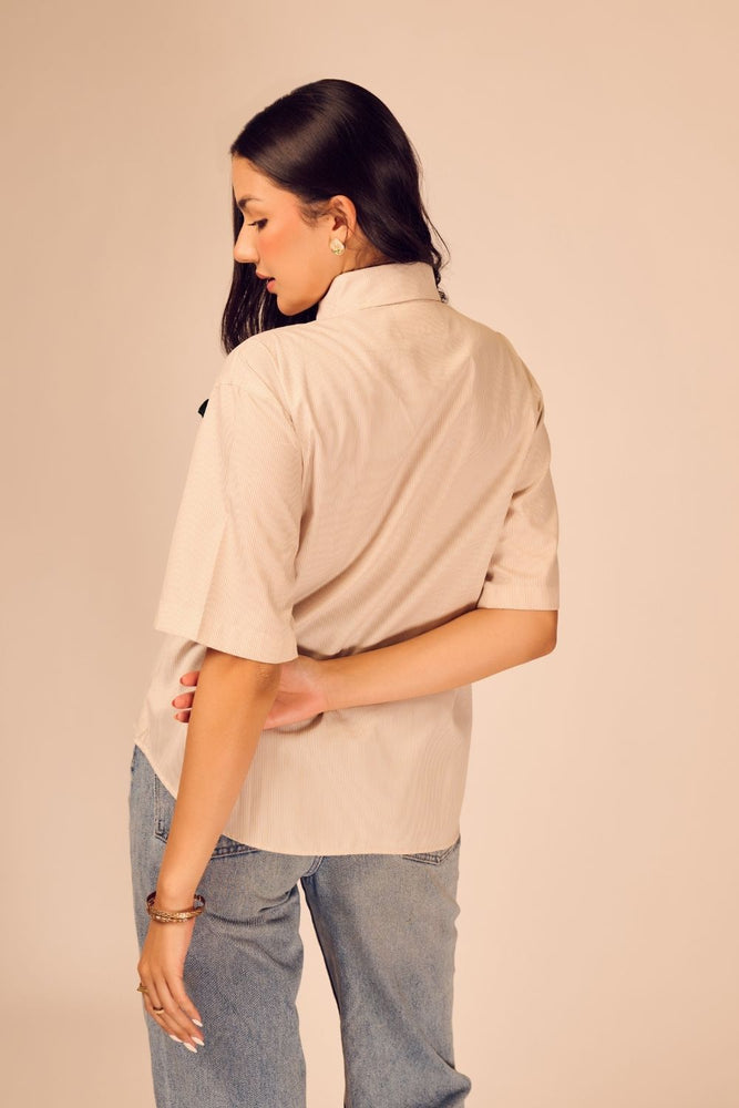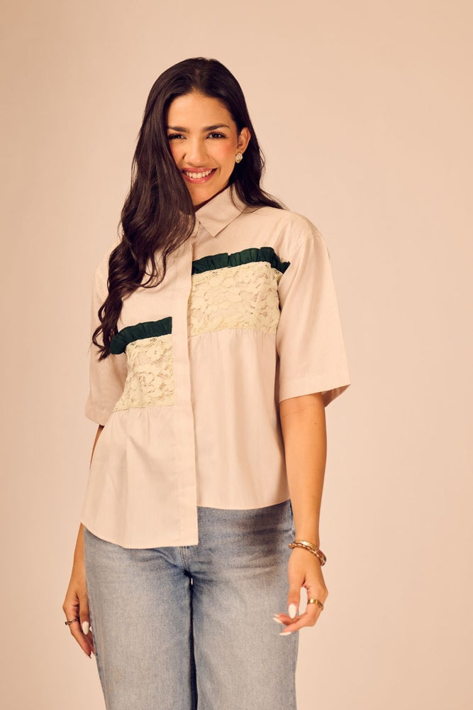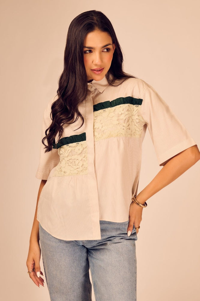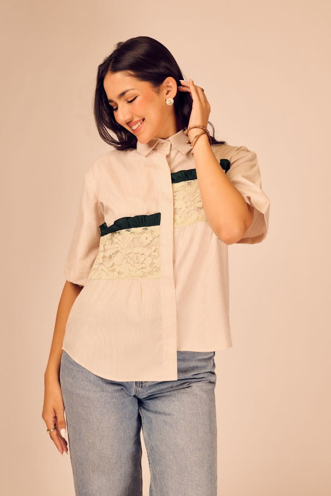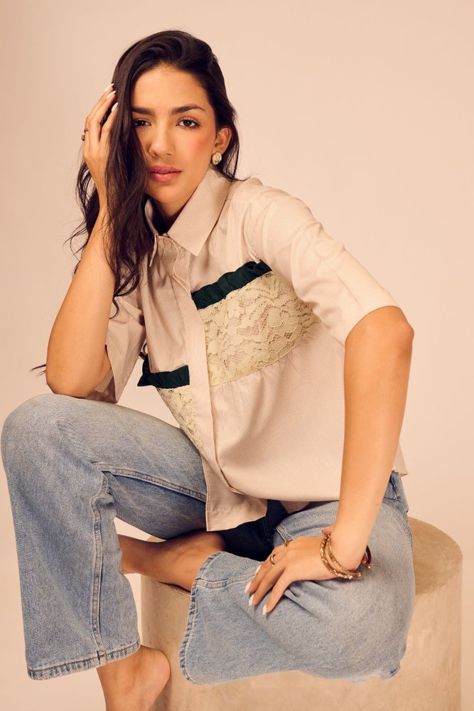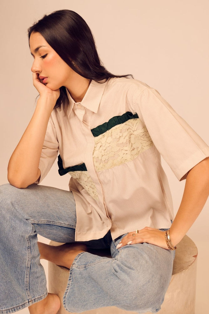 A playful take on linear minimalism, this striped cotton shirt features an asymmetric up-and-down hemline enhanced with soft mint lace patching. Contrasting emerald green frills add a vibrant pop of color and movement.
