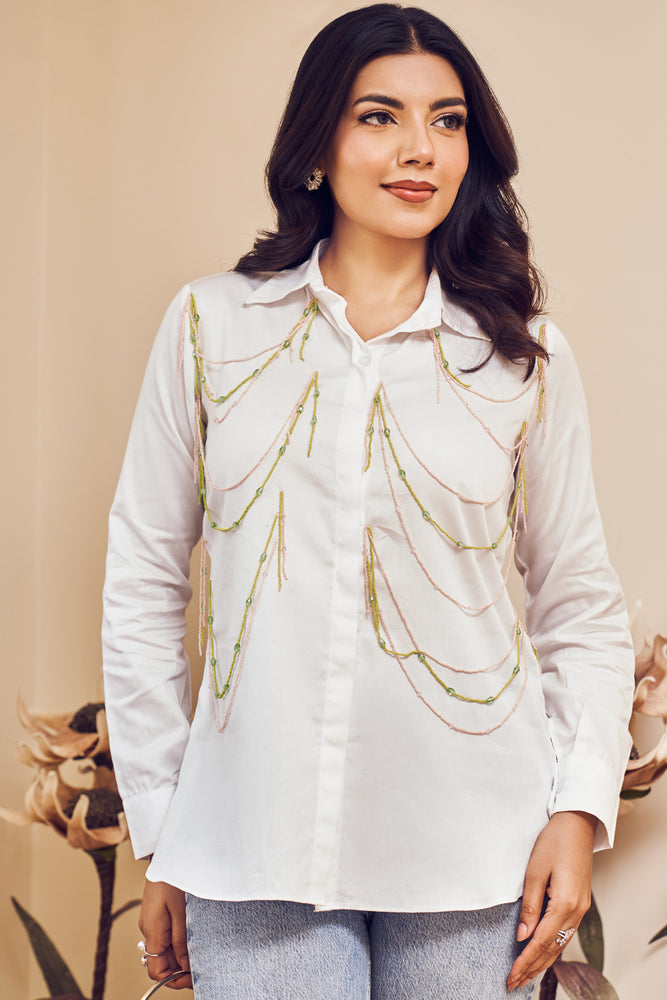 Who says white isn't edgy! We got the memo right with this crisp white collar shirt designed with lines of pastel beads done in yellow, baby pink and green!- Delivery time within India - 10-15 business days.