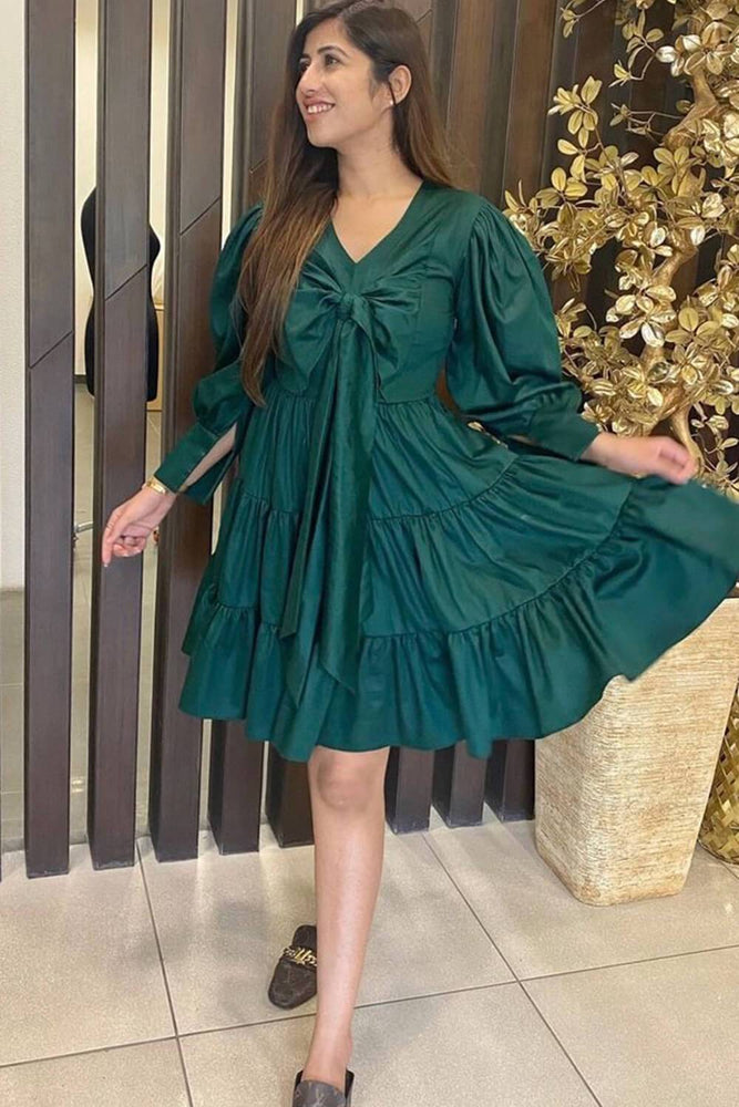 • Details - Layered Short Dress With Puff Sleeves & Front Bow