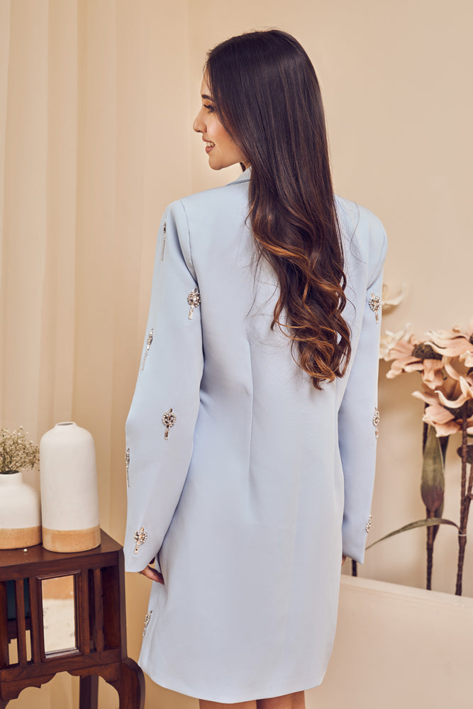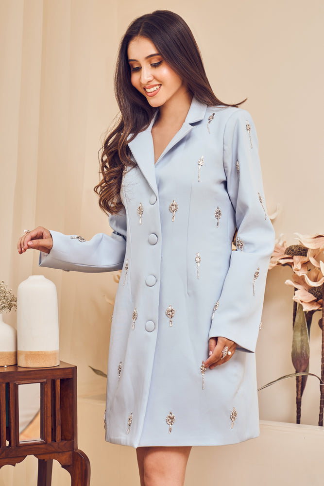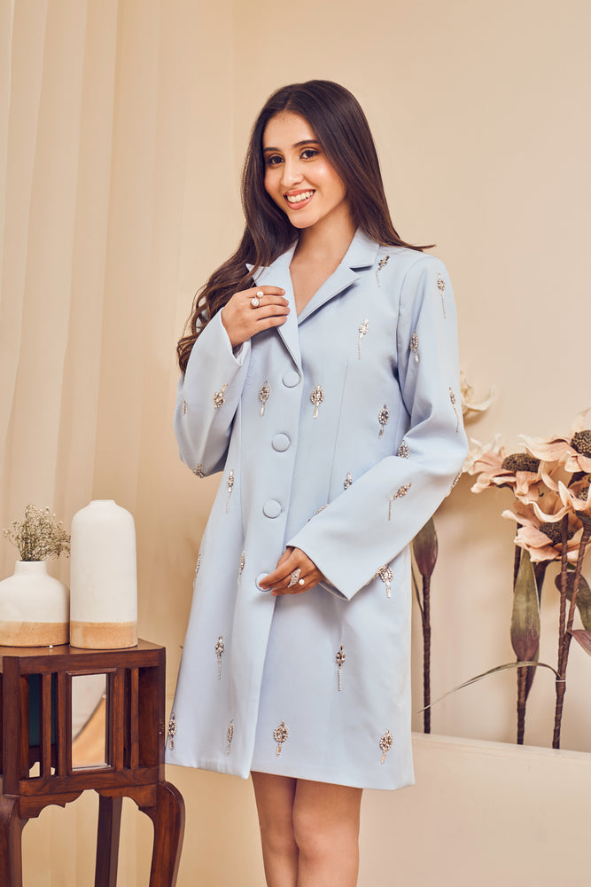 This gorgeous short-notched, pastel blue blazer dress is as summer chic as it gets! Picture yourself strutting in confidence, flaunting its intricate embroidery pattern with shining drops that are sure to turn heads and spark conversations!- Delivery time within India - 10-15 business days.