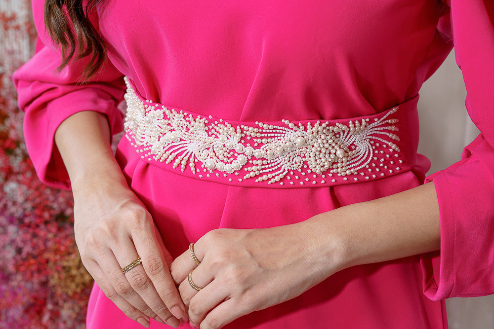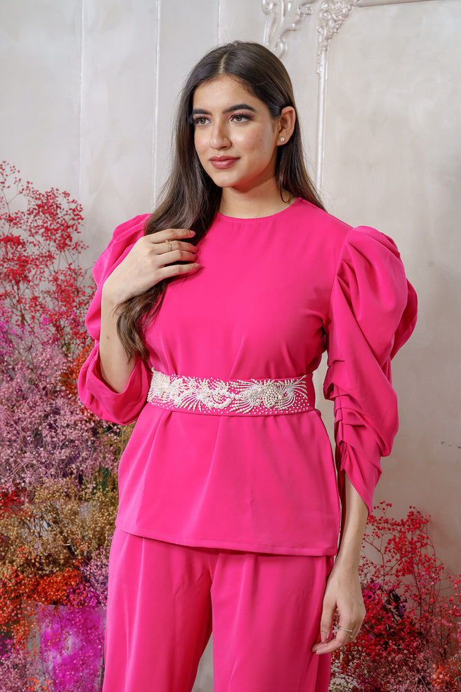 • You will receive a hot pink top, a belt and a pant • It has a beautiful embellished belt. • Round neck • Exaggerated sleeve • 3/4th sleeve • Straight fit pants • Pleat detailing in the pant • Tailored fit