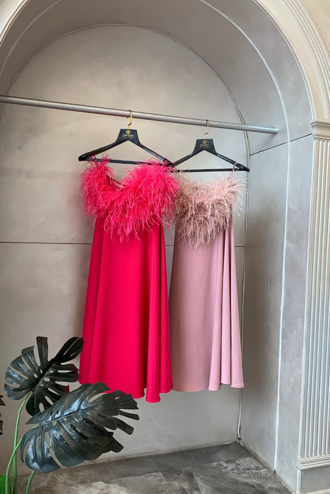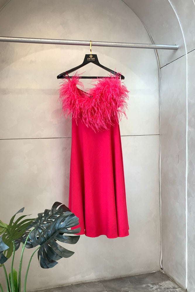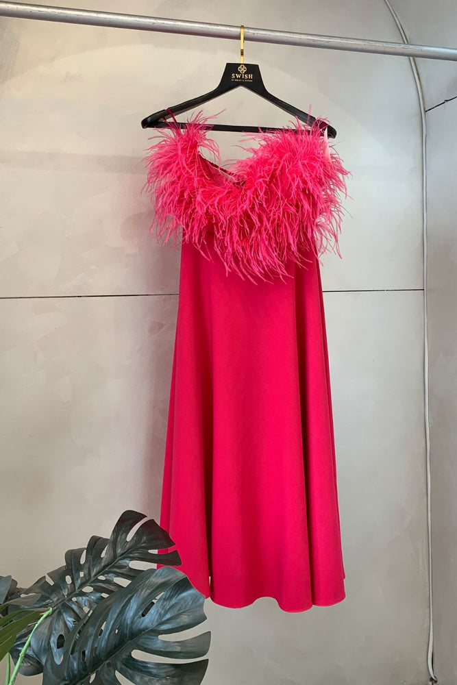 Hot pink Moss Crepe Midi Dress Loaded with Feathers.
