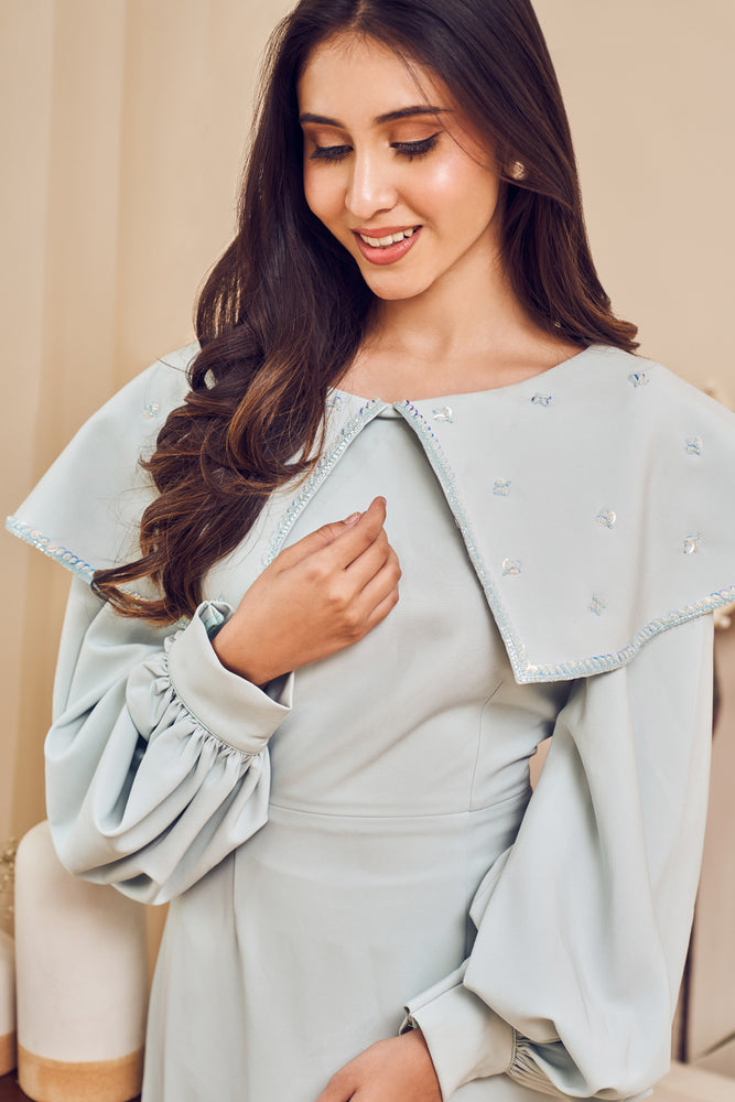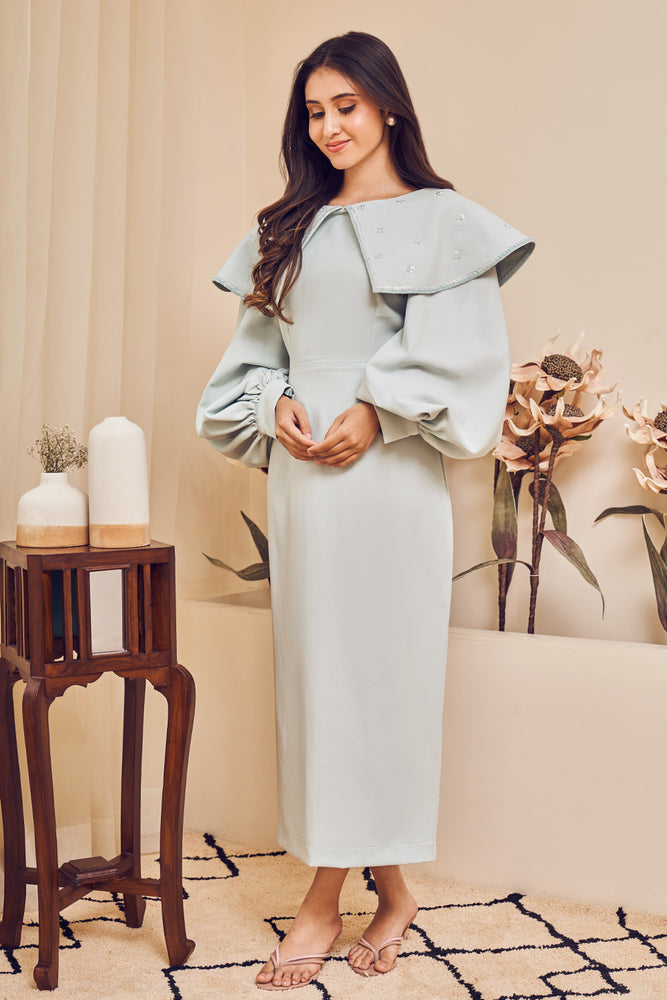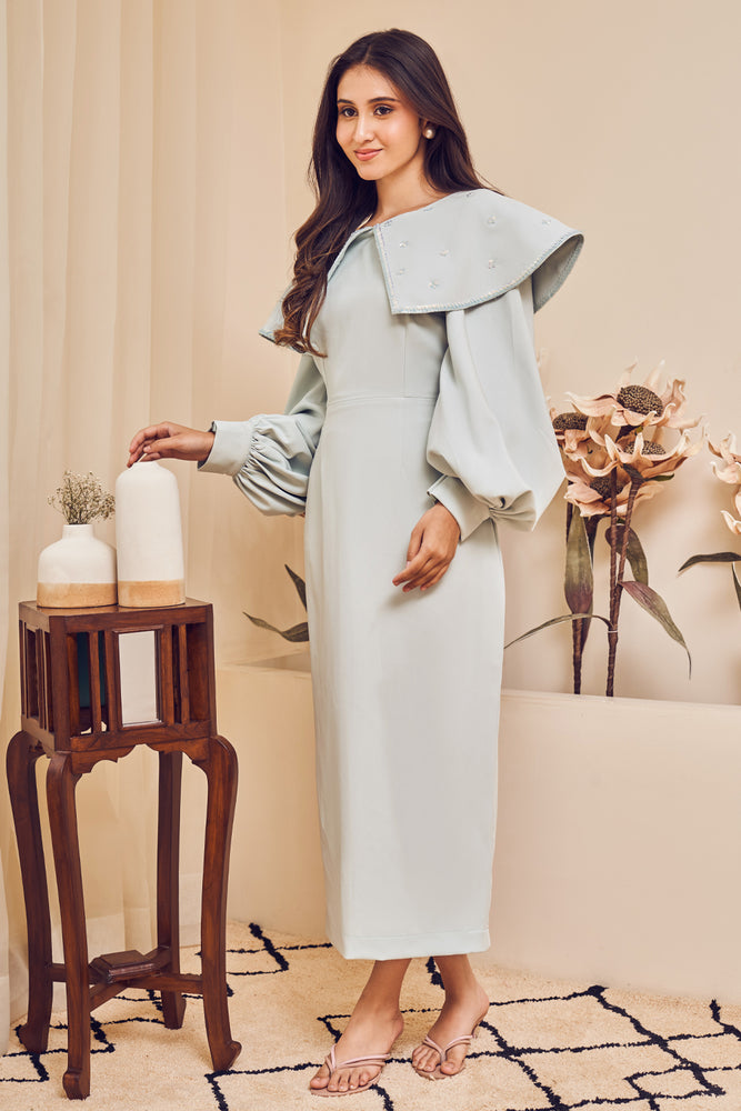 With a stylish imperial short cape attached and elegant bishop sleeves, meet the unforgettably beautiful mint sheath dress! Did you notice the gorgeous three-leafed flower detailing on the cape!?- Delivery time within India - 10-15 business days.
