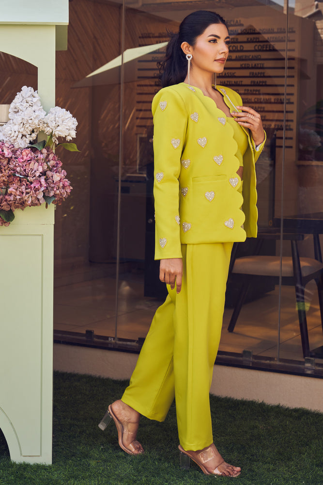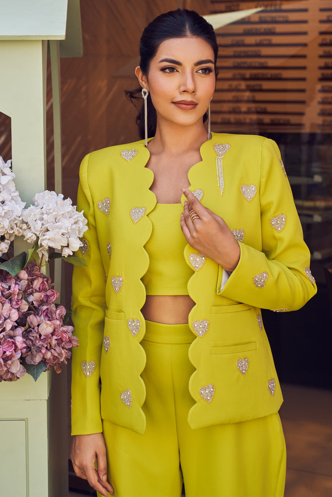 Rule the board room with this set! Because when you step into the meeting wearing our scalloped neon blazer with those shimmering hearts, there won't be an eye that strays from you!- Delivery time within India - 10-15 business days.