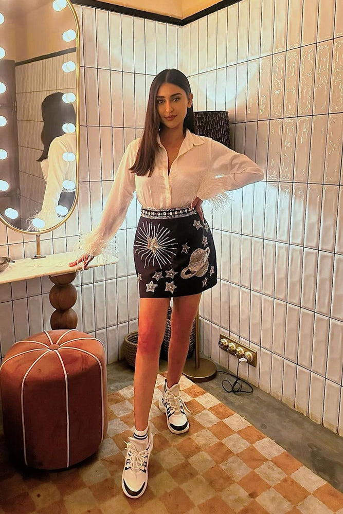 Capturing the heavenly sky, this skirt is the perfect statement piece for any party you're at! With a statement waistline, the skirt showcases hand-embroidered shimmering celestial bodies on the darkest base.- Delivery time within India - 10-15 business days.