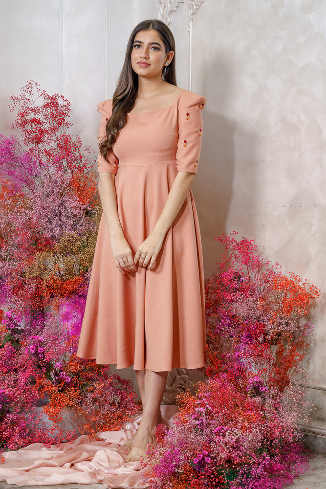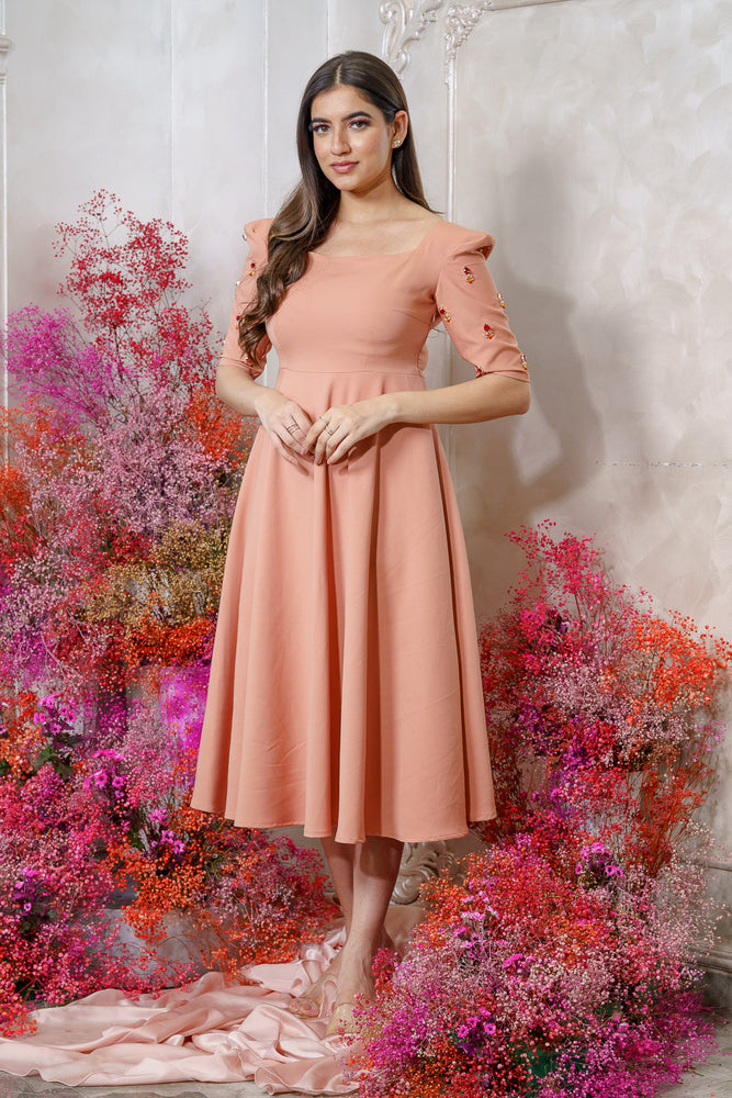 • You will receive a light orange moss crepe dress. • It has beautiful embellishments on the sleeves • Flared dress • Square neck • Elbow sleeve • Side Zip • Midi dress • Tailored fit