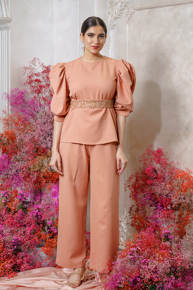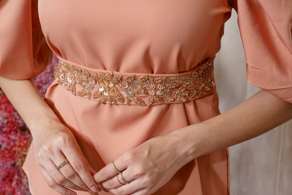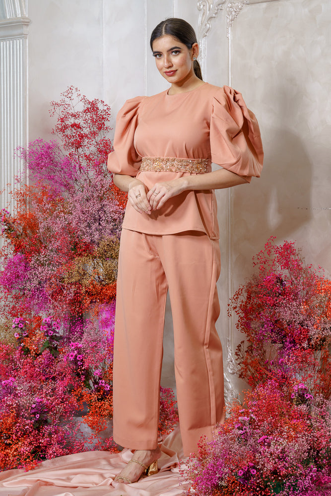 • It has a beautiful embellished belt. • Round neck • Exaggerated sleeve