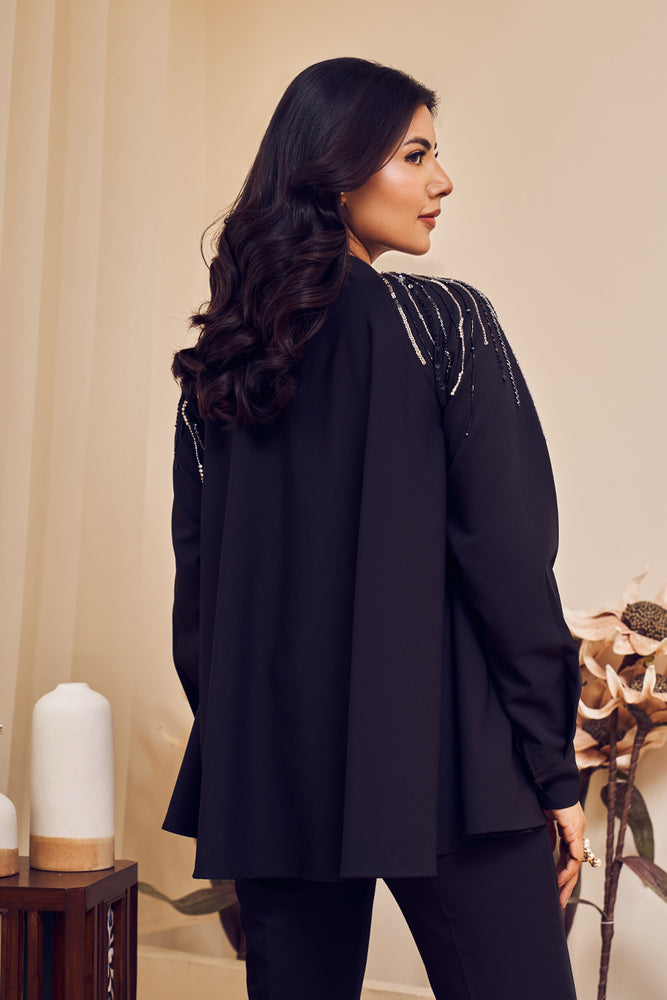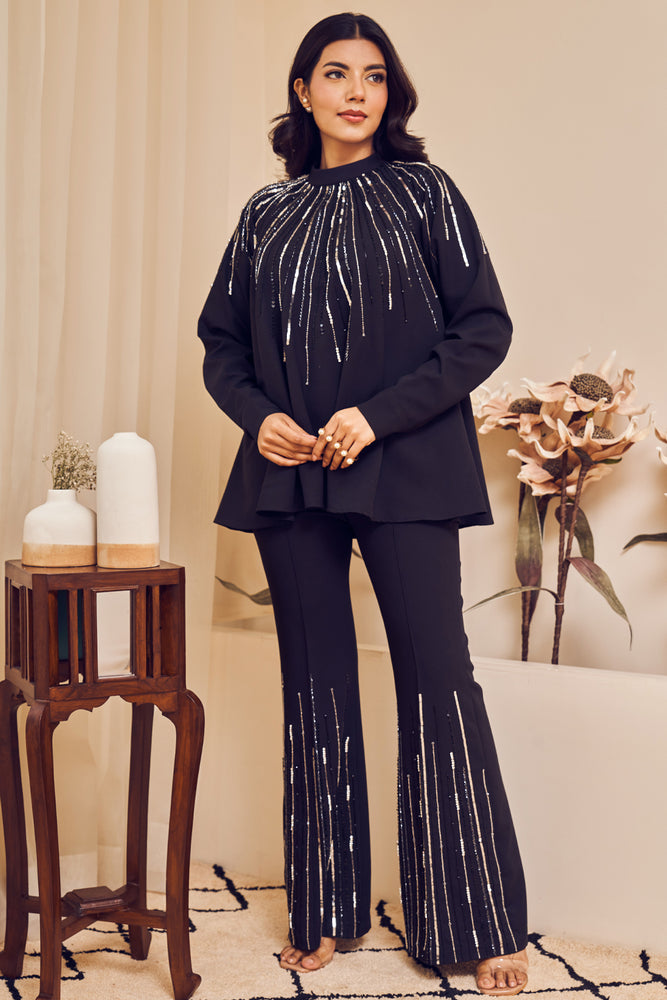 Like a star, she never ceases to sparkle. An in-house favourite, this co-ord features lines of starry sequins, beads and more on flared shirt and pants.