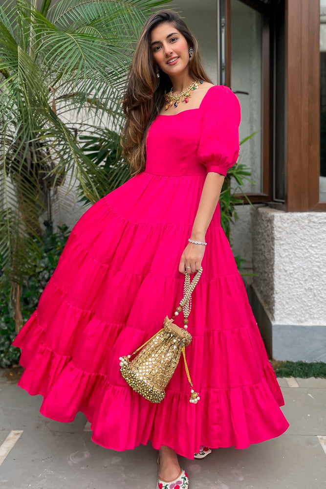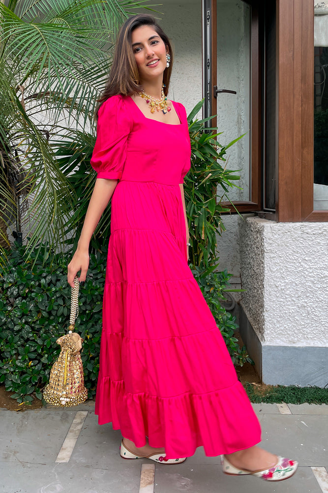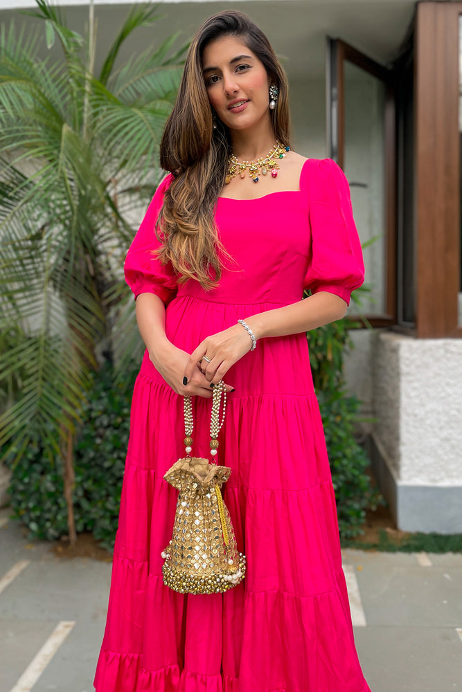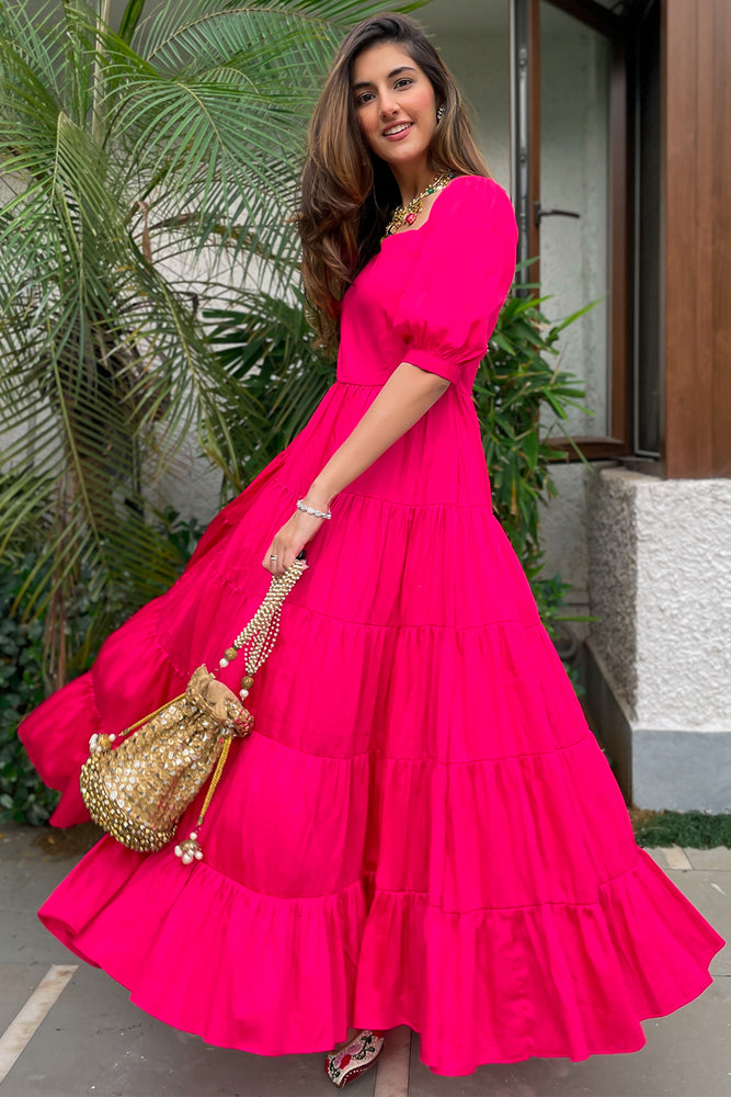 • Details ; Layered Cotton Dress With Square Neck and Ballon Sleeves