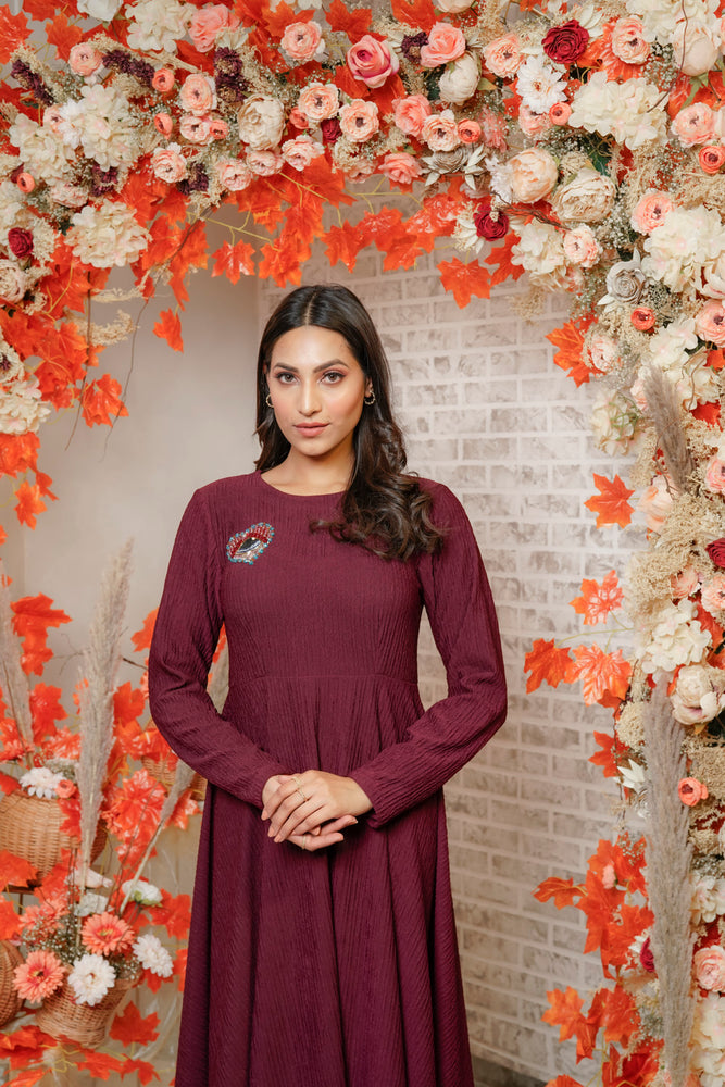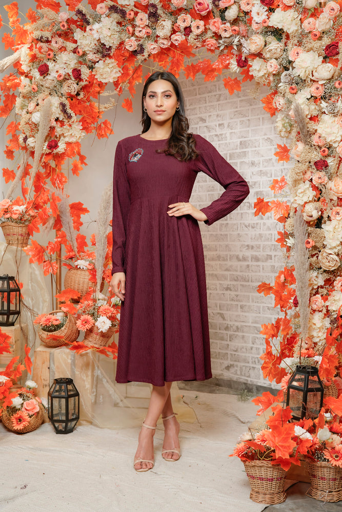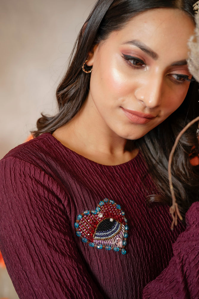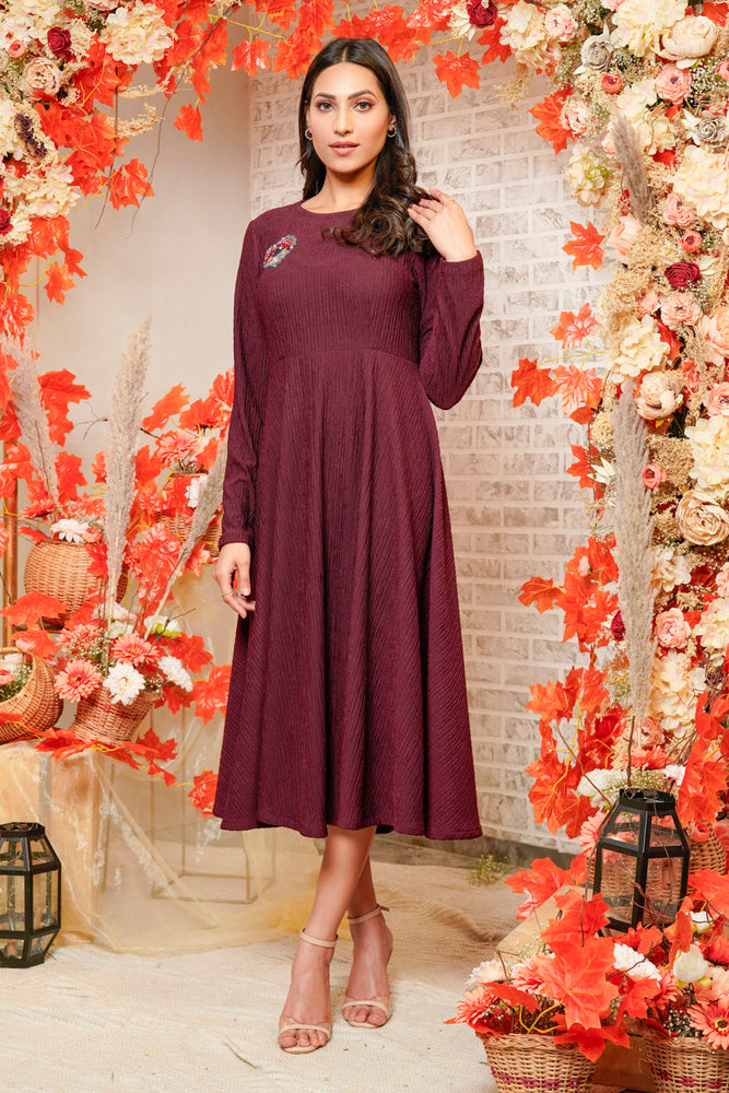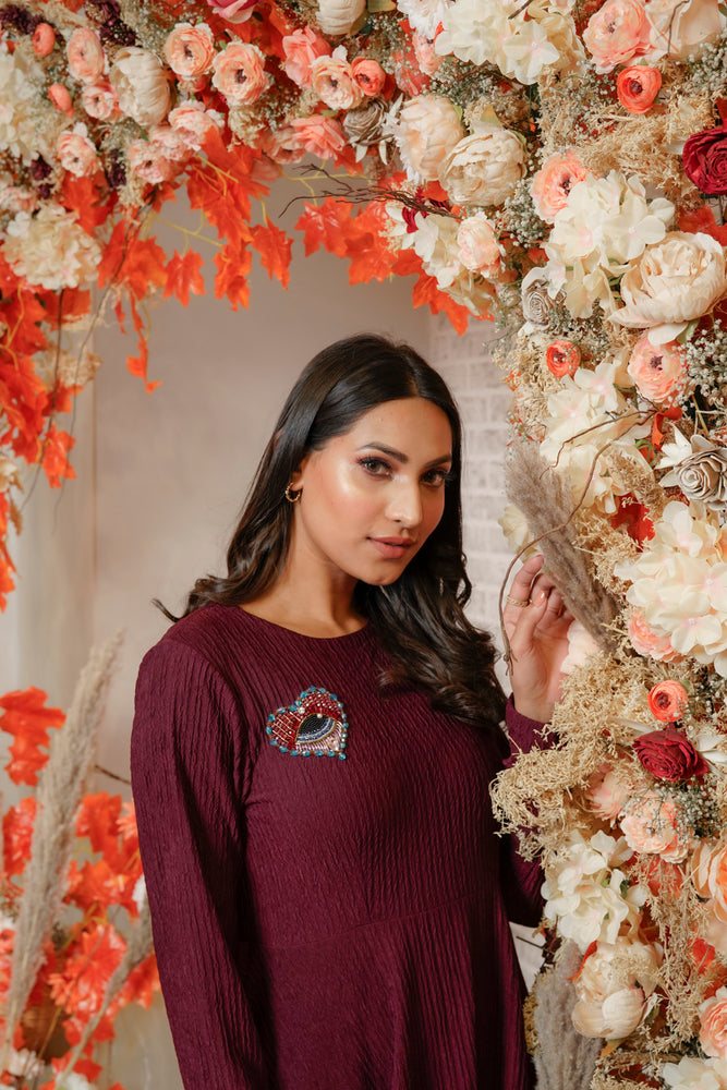 Maroon textured scuba A-line midi dress with heart evil eye embellishment.