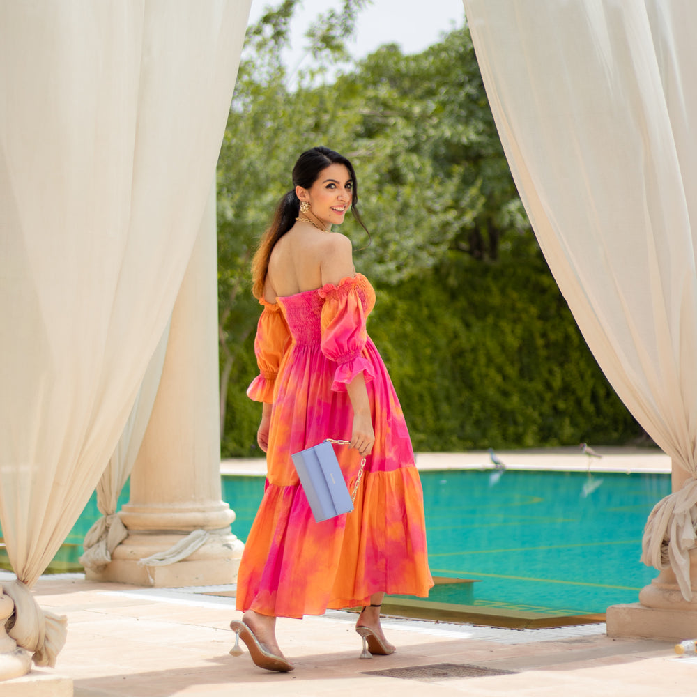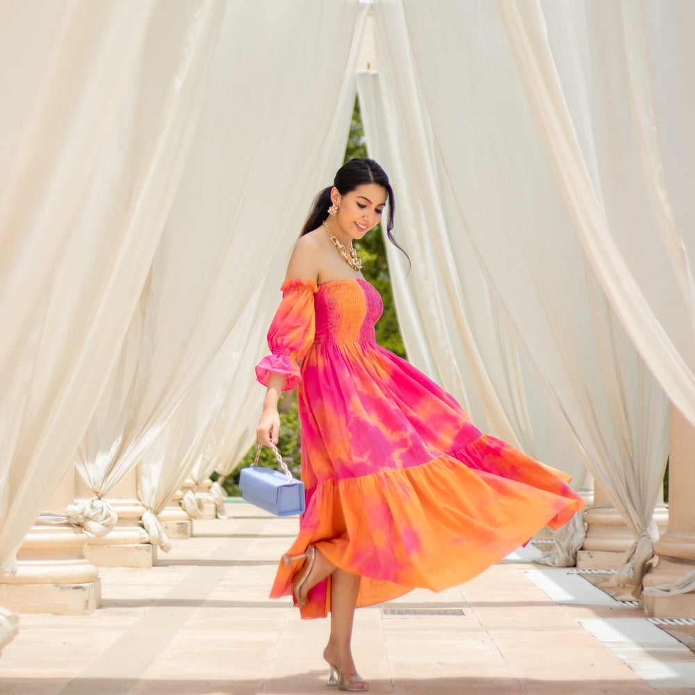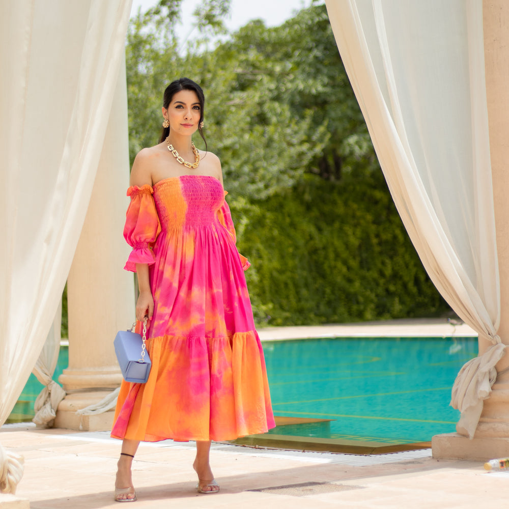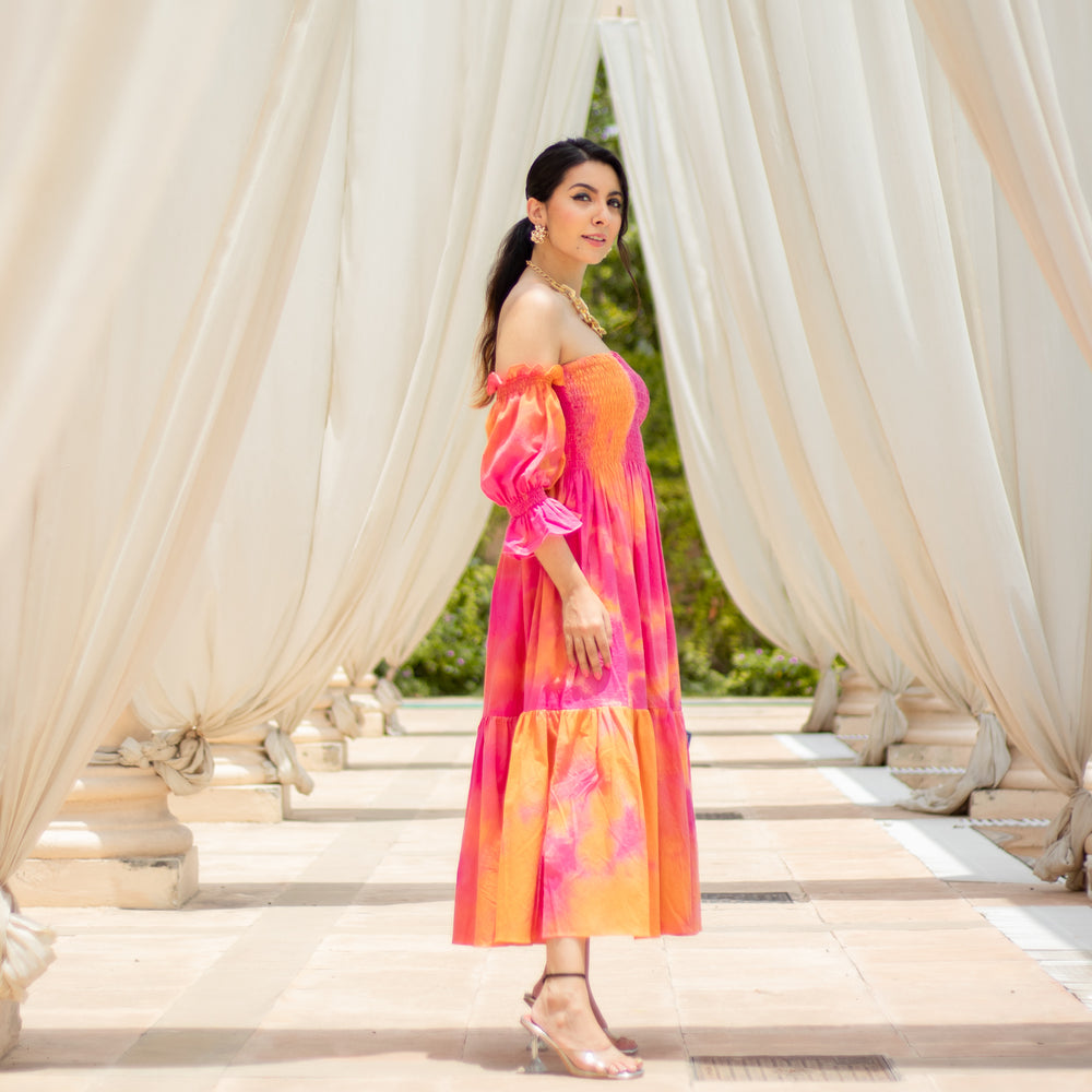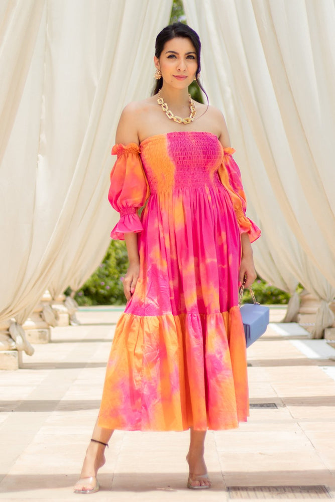 Off Shoulder Midi Dress With smocked Body , Ballon Sleeves With Two Layer FlareHandDye - Yes