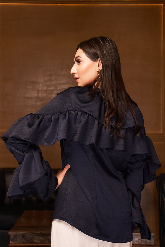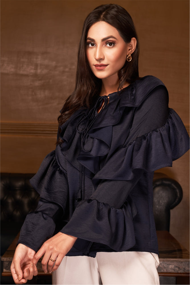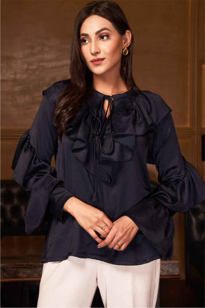 • Long sleeves with across frills • Tie up straps on neck • Full Sleeves • Tailored Fit