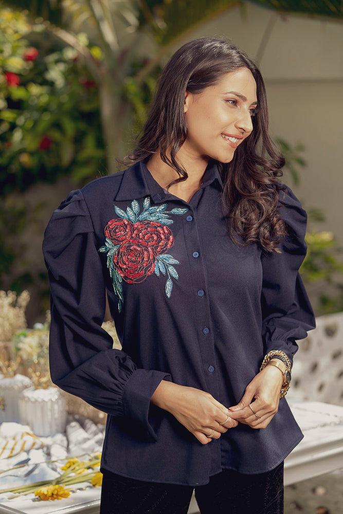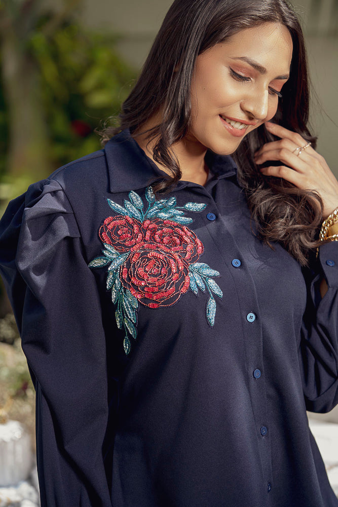 • Beautifully embellished red sequence rose on the shoulder.
