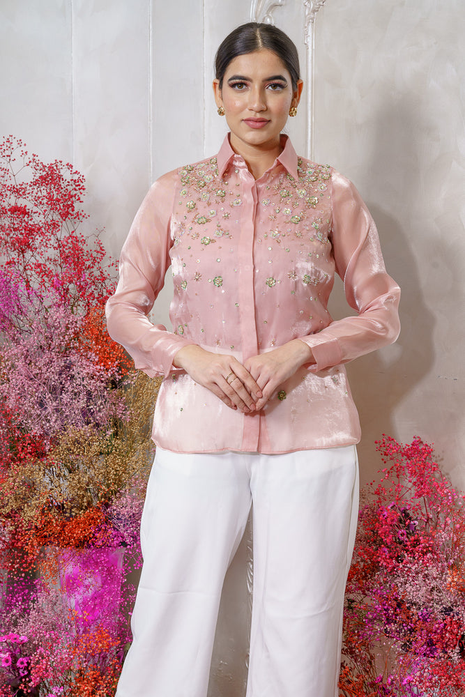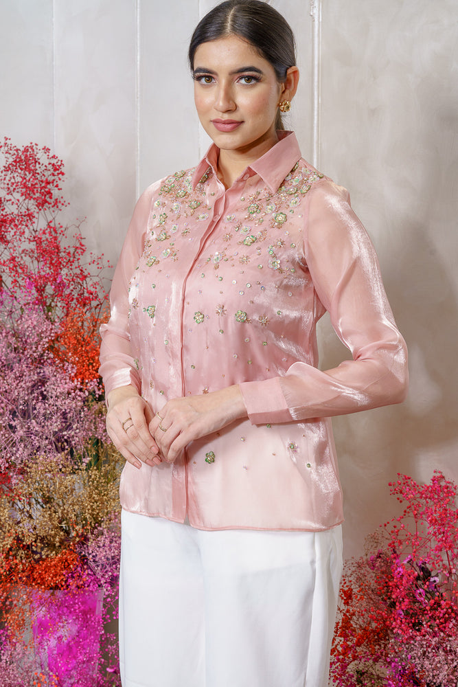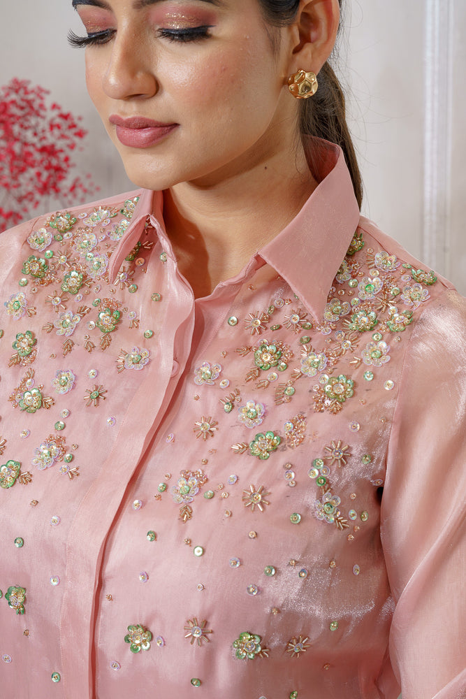 • You will receive a peach paper organza shirt with a shantoon inner • It has beautiful embellishment in the front • Double placket