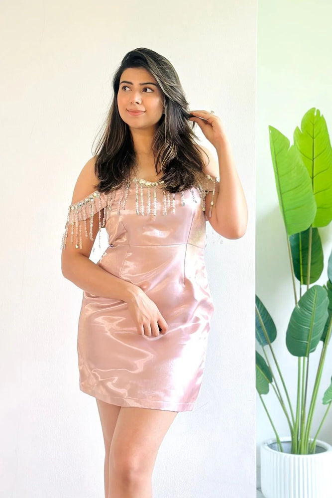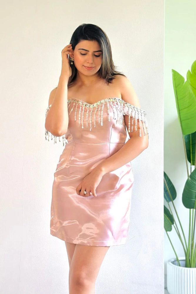 • Off shoulder neckline • Short dress • Back zip • Tailored fit