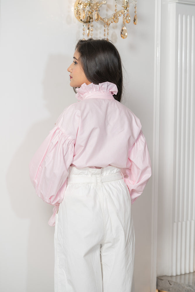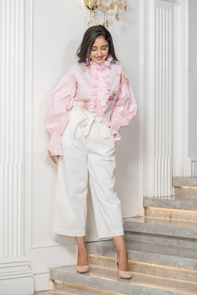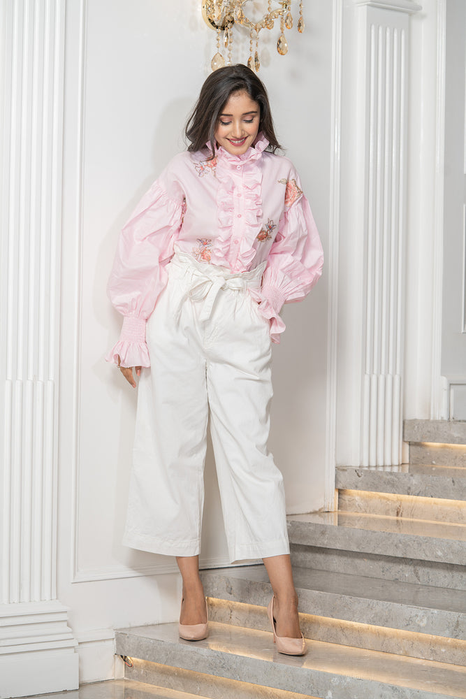 • Details ; Pink Cotton Ruffle Shirt , With Smocked Cuff & Floral Patches All Over