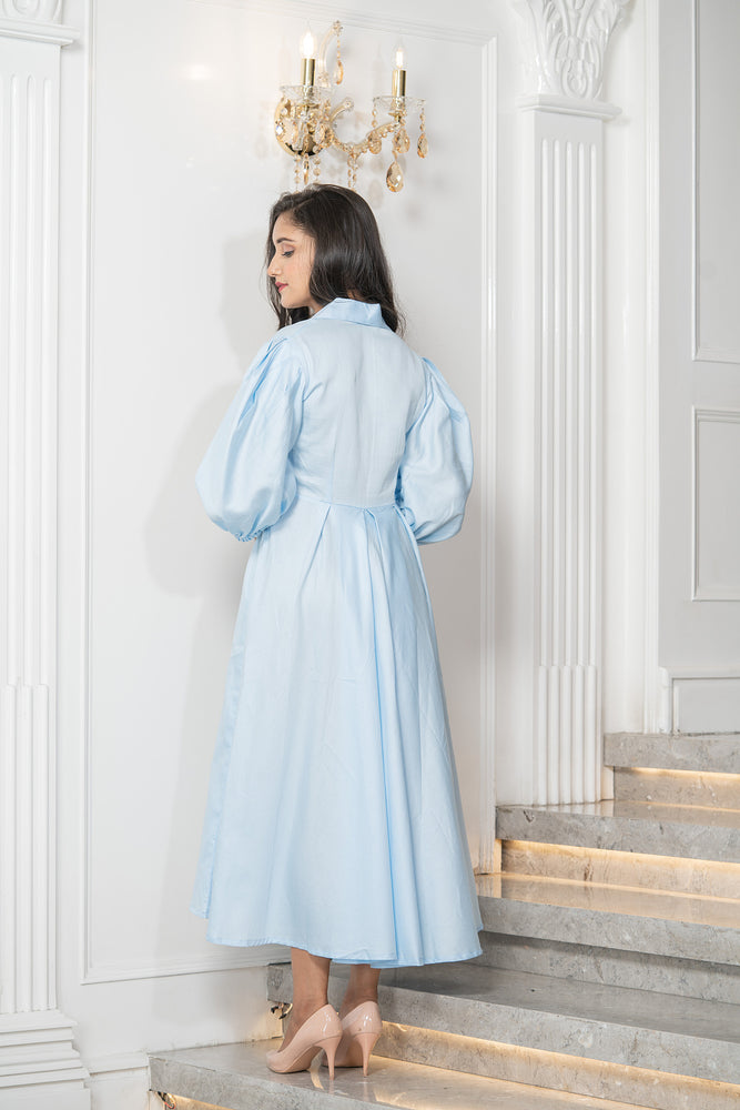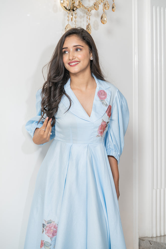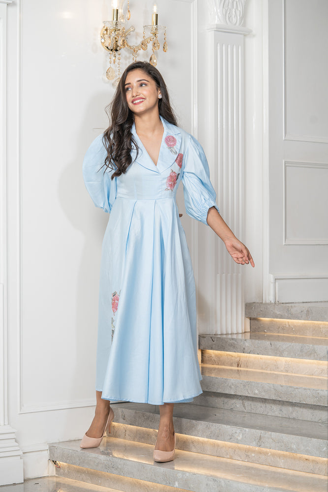 • Details ; Ballon Sleeve Midi Dress With Patch & Golden Zari Highlight