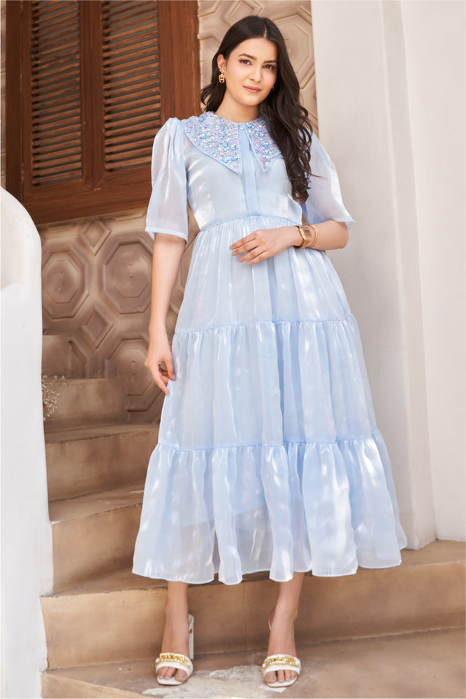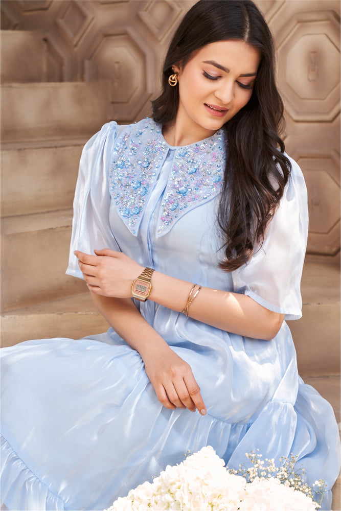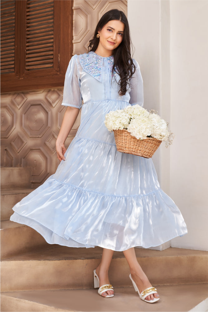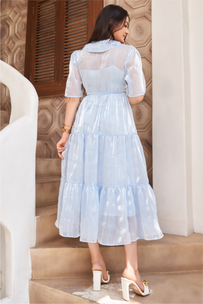 You will receive a powder blue paper organza midi dress and a shantoon inner • Embellished collar