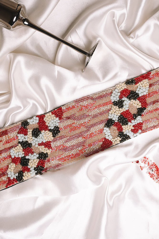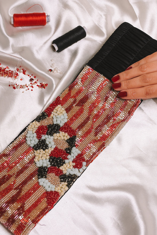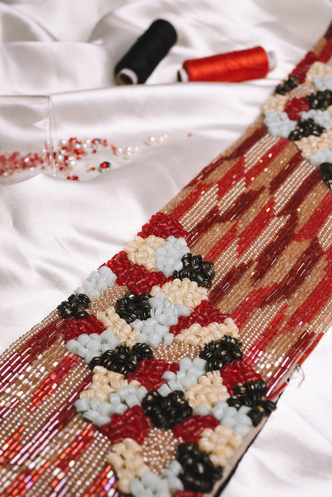 Red, green, mint green, beige sequence clustered with red and beige cutdana and poth abstract lines.