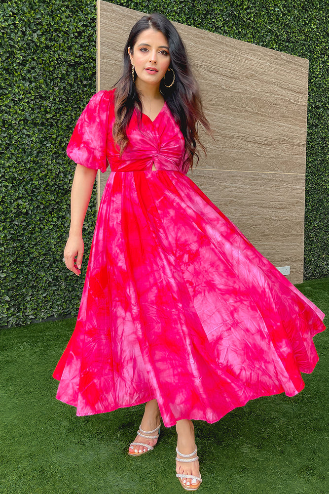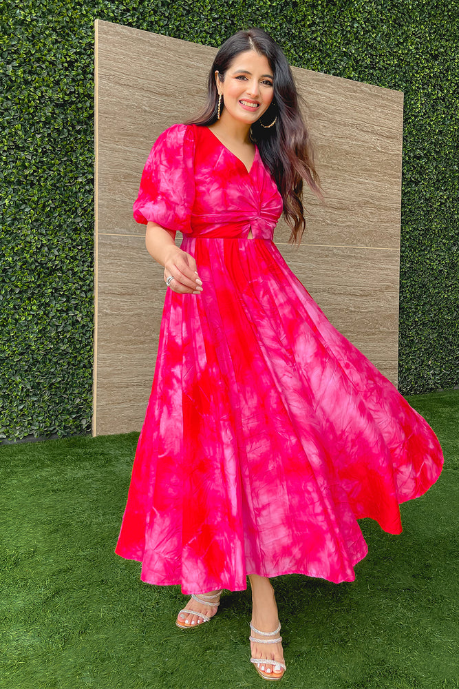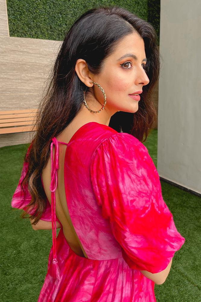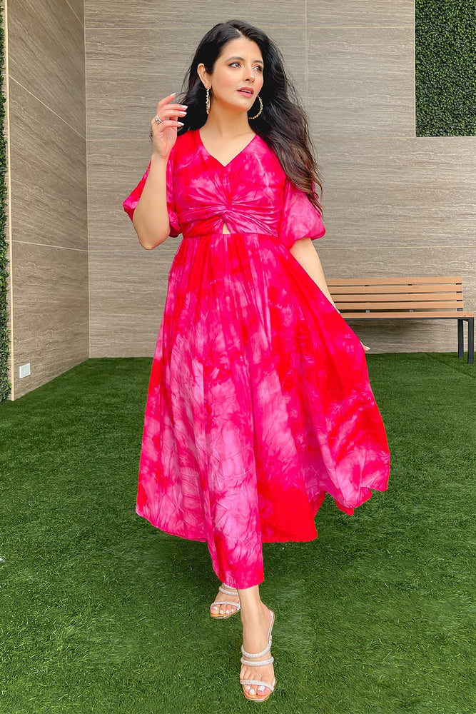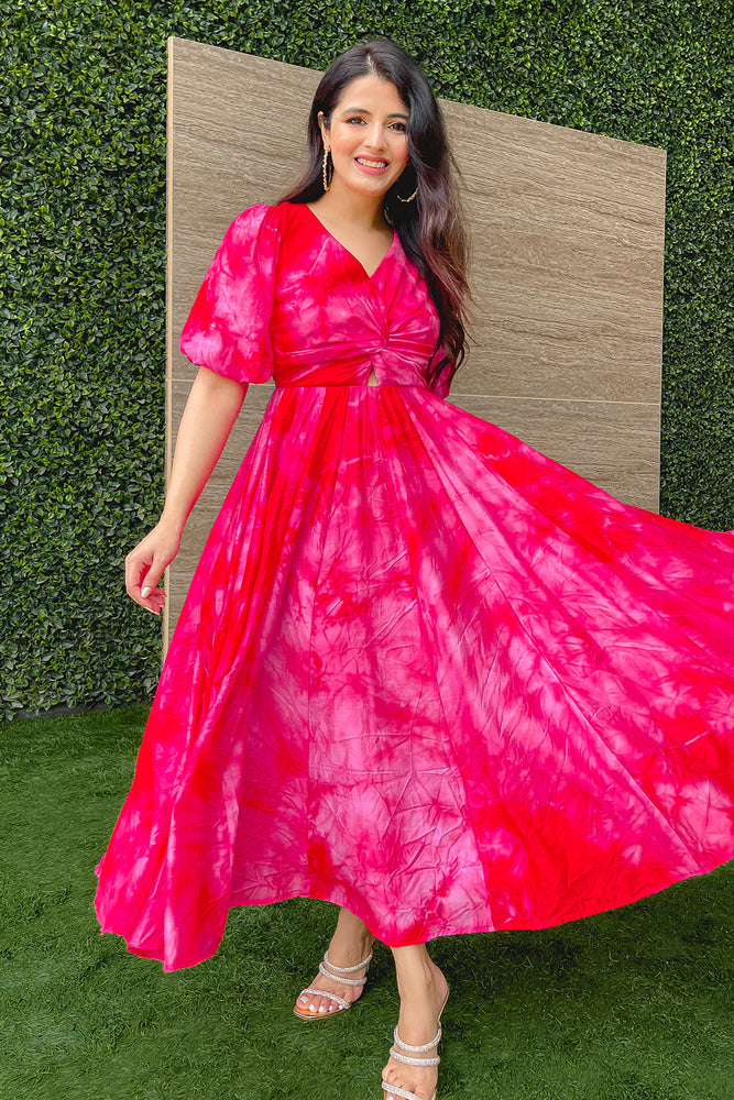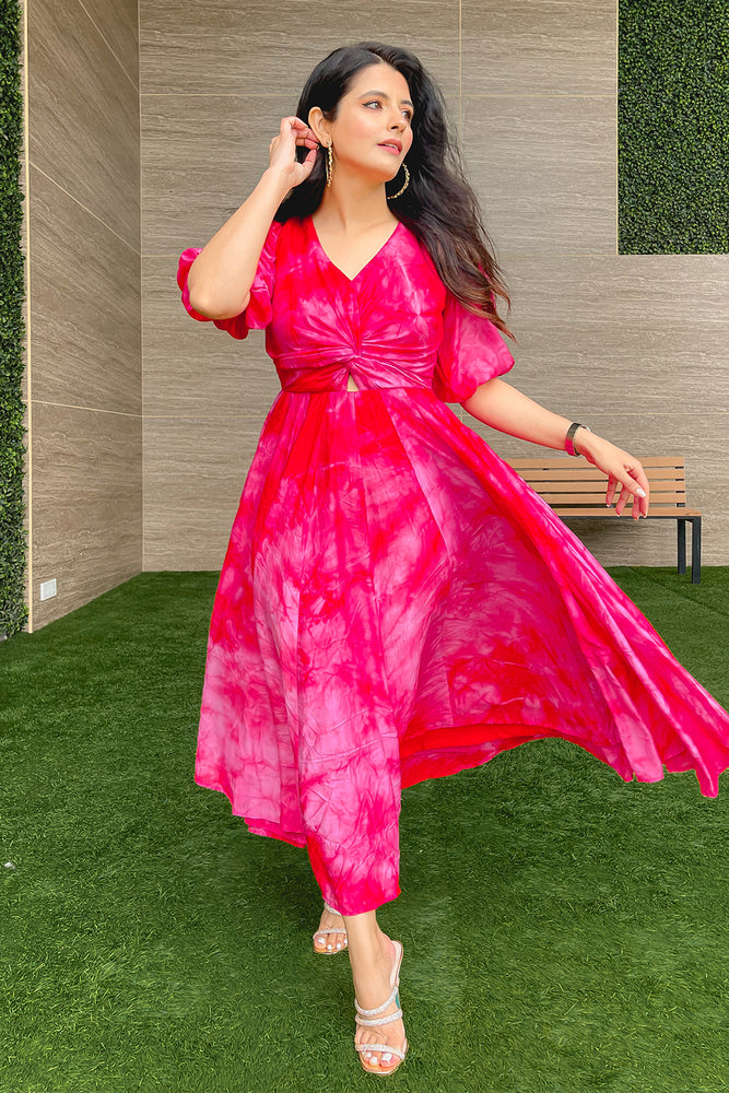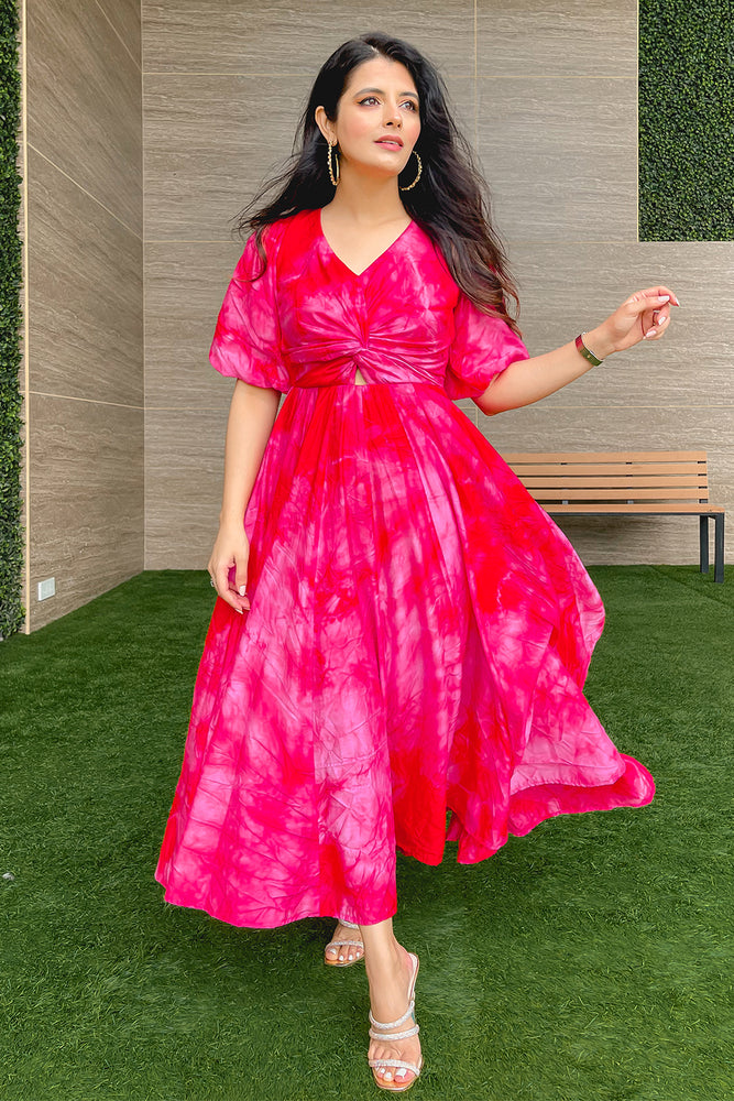 Midi Dress With V-Neck ,Front Knott and waist Cut With Kali Gher and Ballon SleevesHandDye - Yes