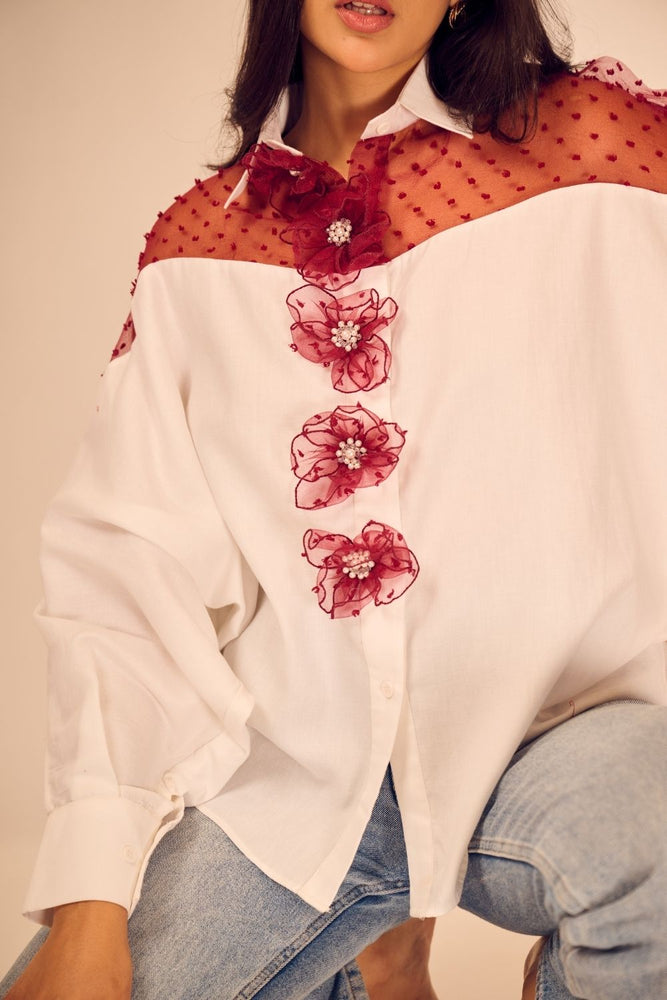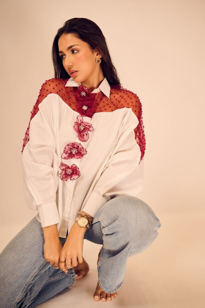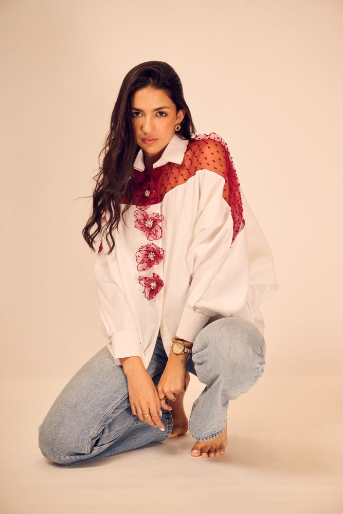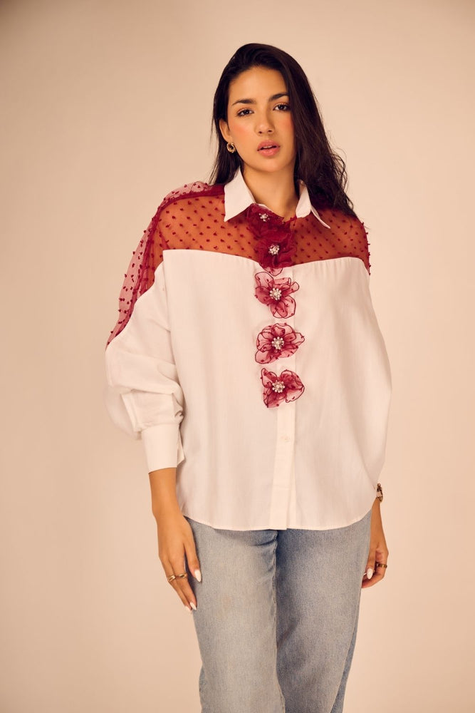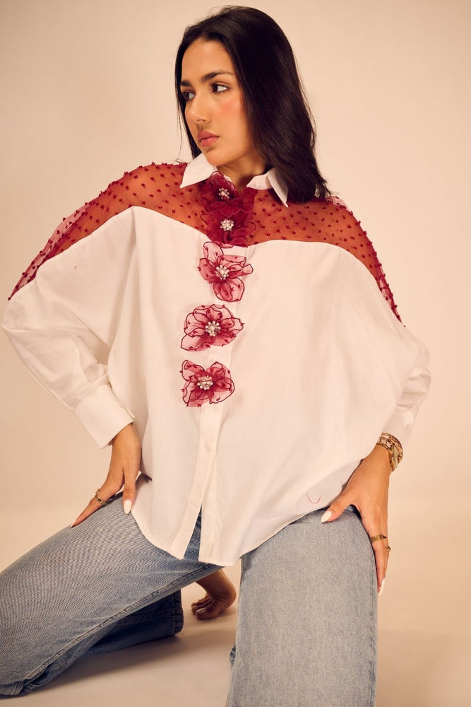 A sculptural beauty with a romantic soul. This ivory cotton dolman shirt is designed with voluminous maroon bubble organza on the shoulders and sleeves, creating a dramatic yet wearable silhouette. Handcrafted floral embellishments delicately bloom across the organza, adding artistry and depth to this statement piece.