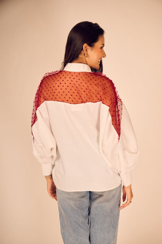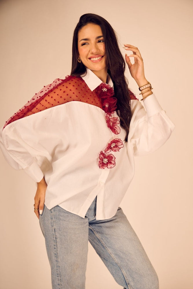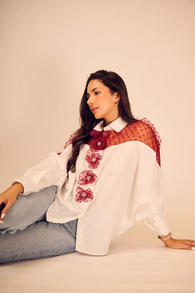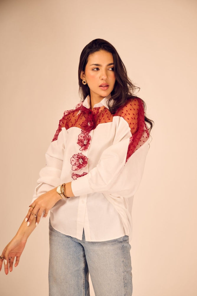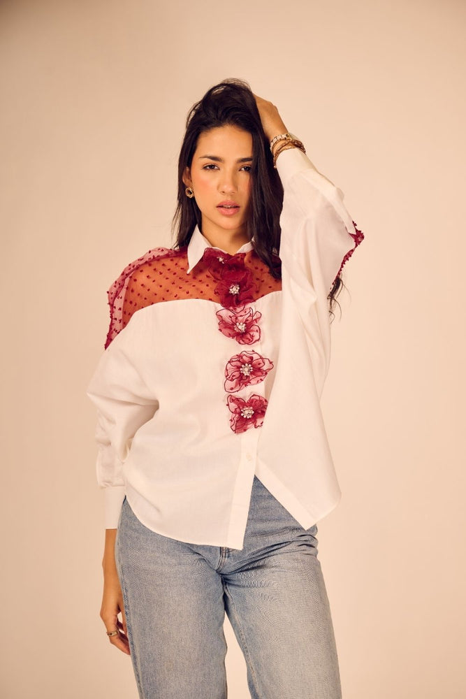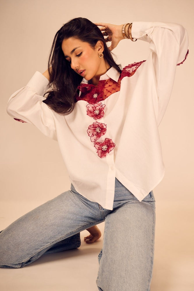 A sculptural beauty with a romantic soul. This ivory cotton dolman shirt is designed with voluminous maroon bubble organza on the shoulders and sleeves, creating a dramatic yet wearable silhouette. Handcrafted floral embellishments delicately bloom across the organza, adding artistry and depth to this statement piece.