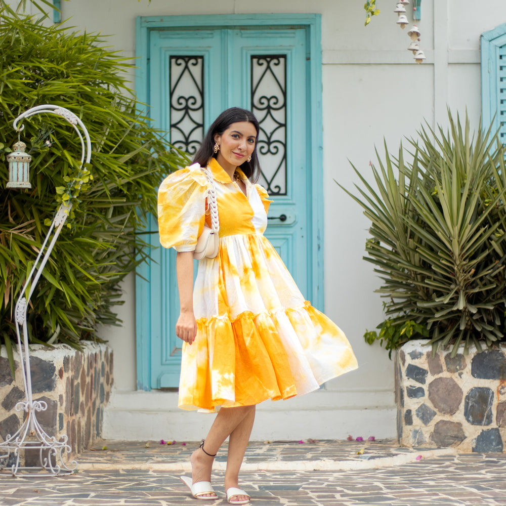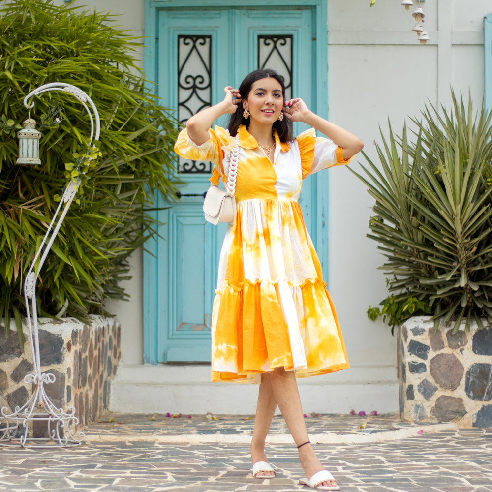Midi Dress With Shirt Collar & Front Placket , Ballon Sleeves With Ruffle Details , Two Layer Flare With RufflesHandDye - Yes