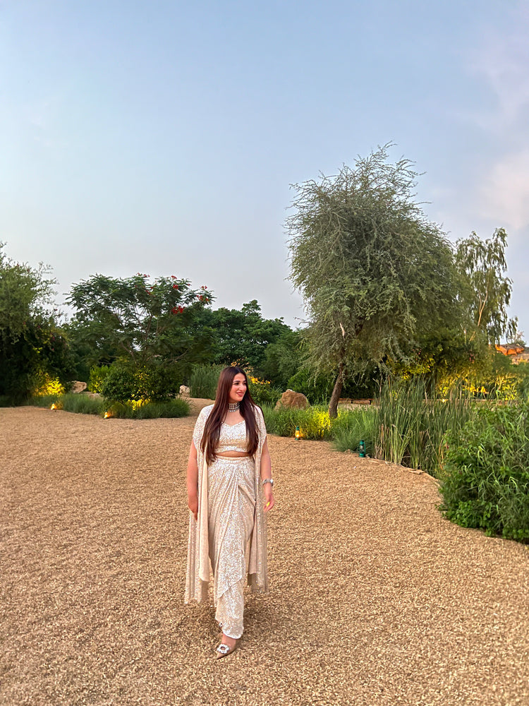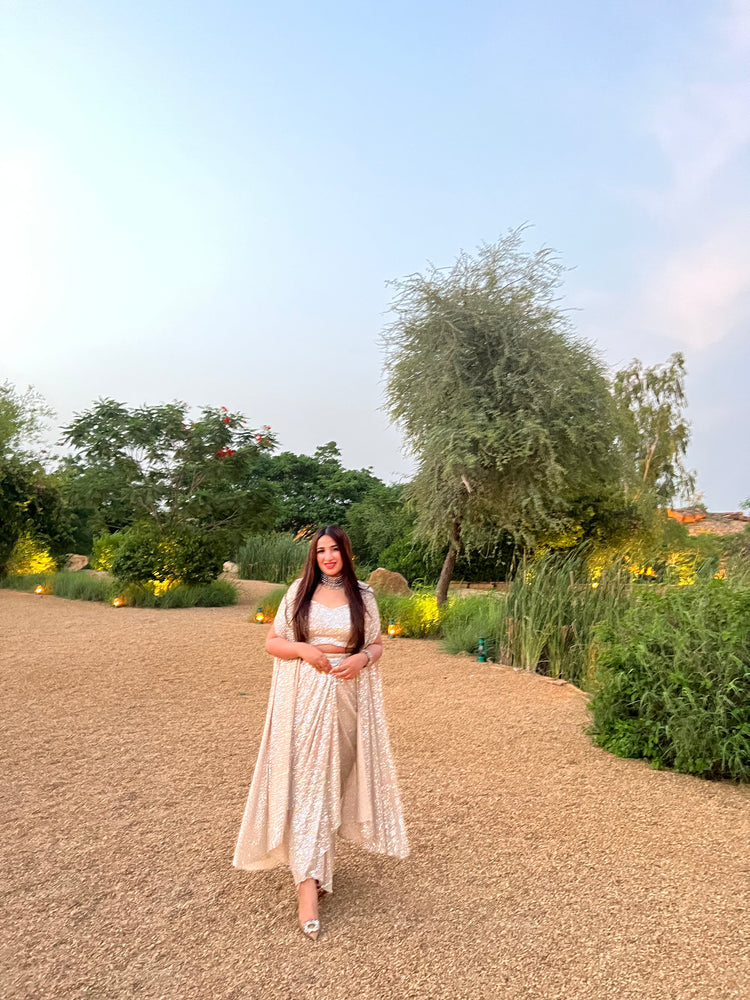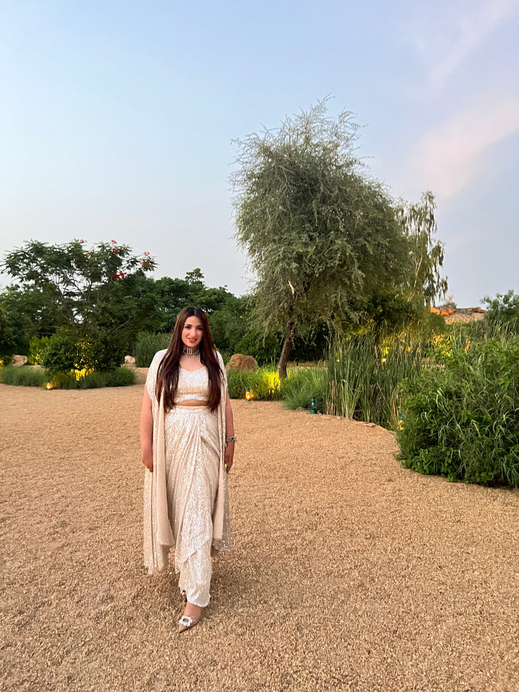 - It’s a set of three , Comes with Dhoti , Cape and Crop Top
