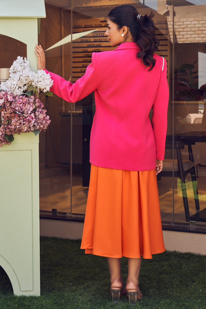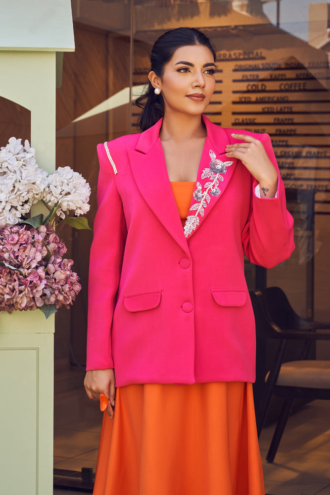 Playing with pops of colours is our new expertise! The solid orange skirt and crop top in perfect contrast to the hot pink blazer with a beautiful floral embellishment on the lapel.- Delivery time within India - 10-15 business days.