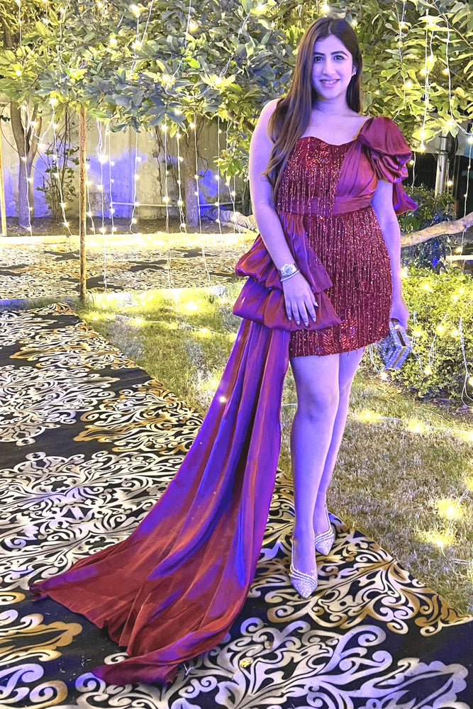 • You wil receive a maroon paper satin short dress • It has a heavily embellished front with beautiful tassel detailing