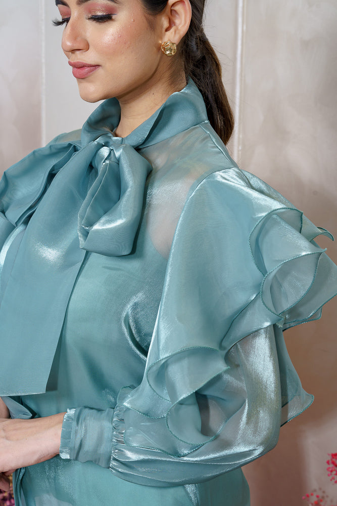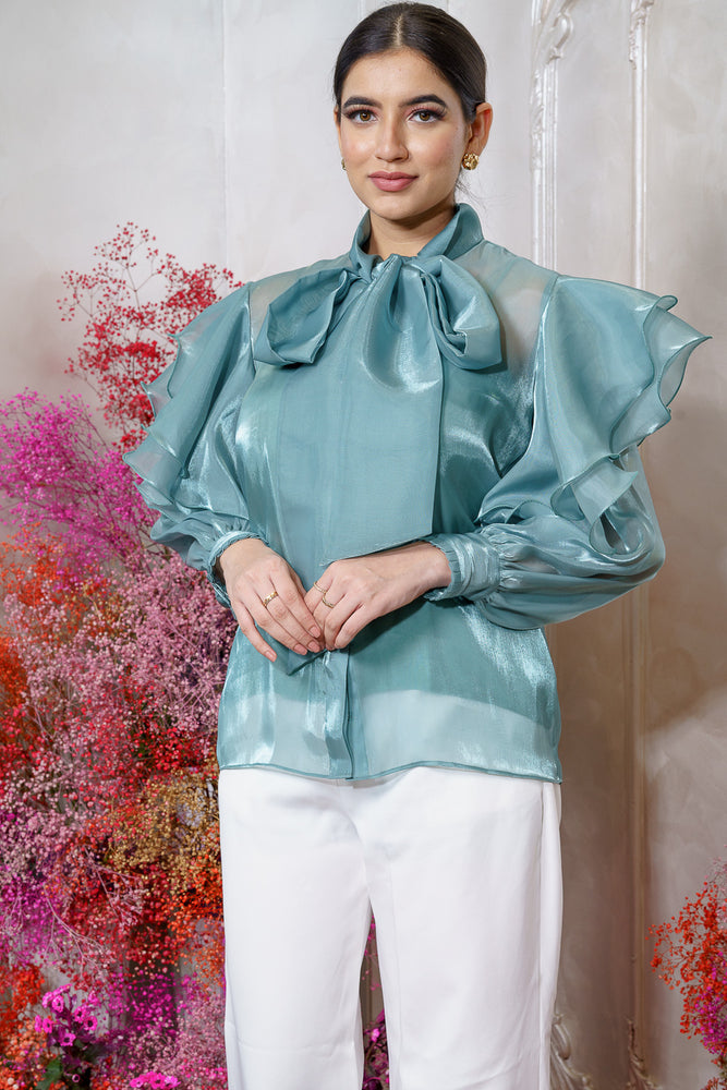 • Tie-up bow neck • Pleats on cuff • Front open button down shirt