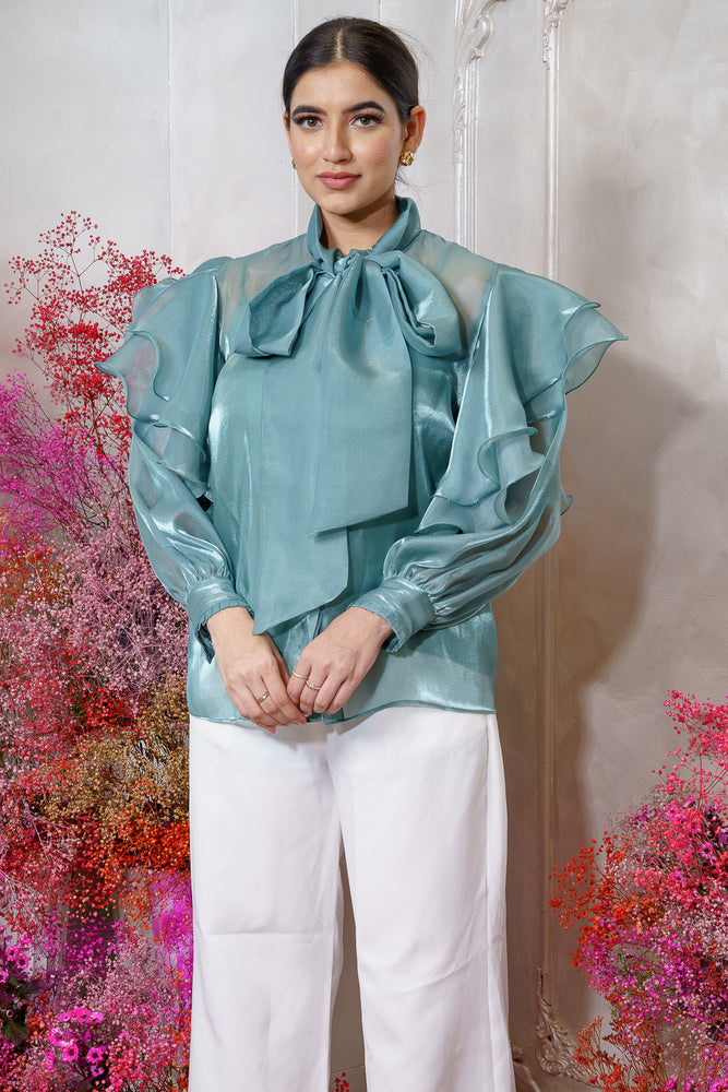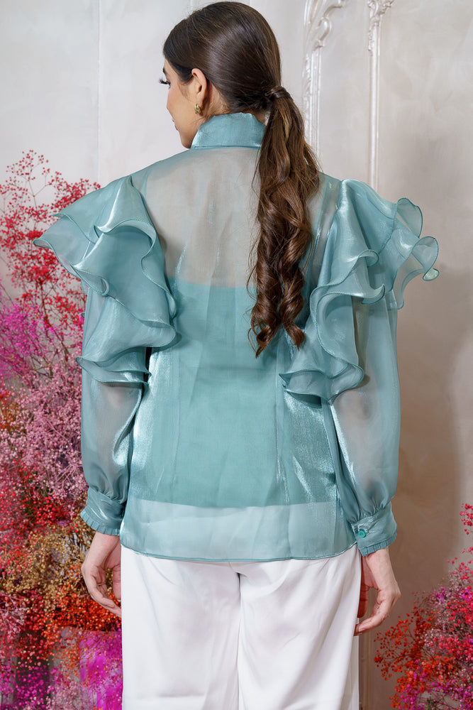 • Gathered sleeve • 2 frills on sleeves • Double Placket • Tailored fit