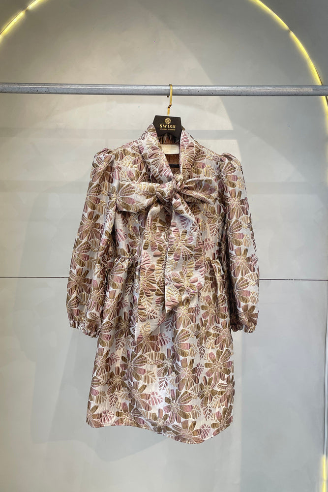 • Details: Peter Pan collar with pleat detailings. Ribbed sleeves. Rushing at waist. Bow tie at collar. Chip fold at hem of the dress